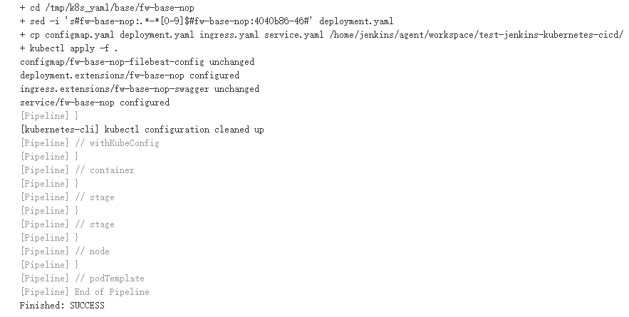 该插件如何使用上面已经做了介绍,我这里的示例直接定义一个新的镜像配置(根据自己实际情况配置),使用前面创建的kubectl容器在持续部署步骤使用withKubeConfig方法用apply命令直接更新服务。