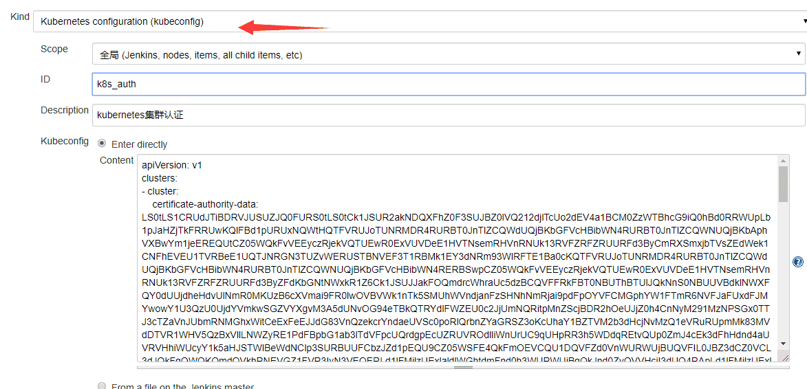 在jenkins中创建使用kubeconfig文件凭证的方式也分多种: