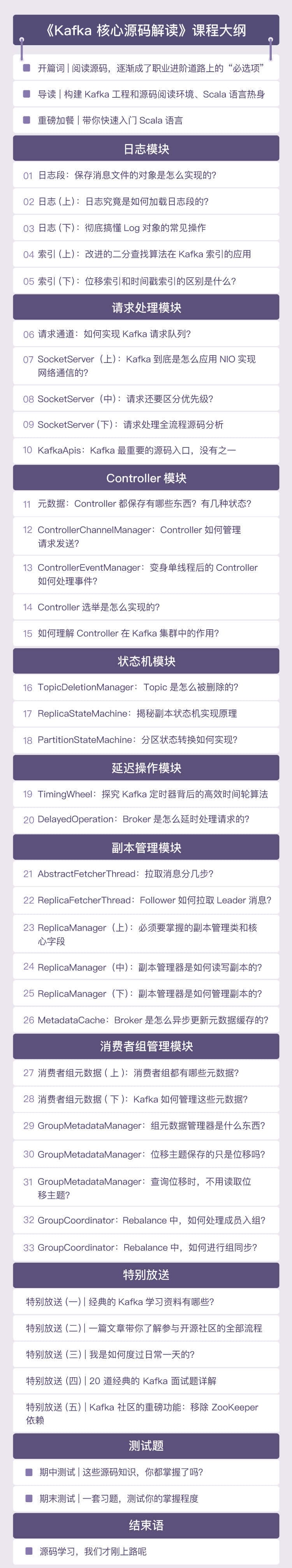 除此之外,我还会跟你分享一些延伸内容。比如成为Apache Kafka社区的代码贡献者的具体方法、实用的学习资料、经典的面试题讲解等,希望你也不要错过这部分的内容。