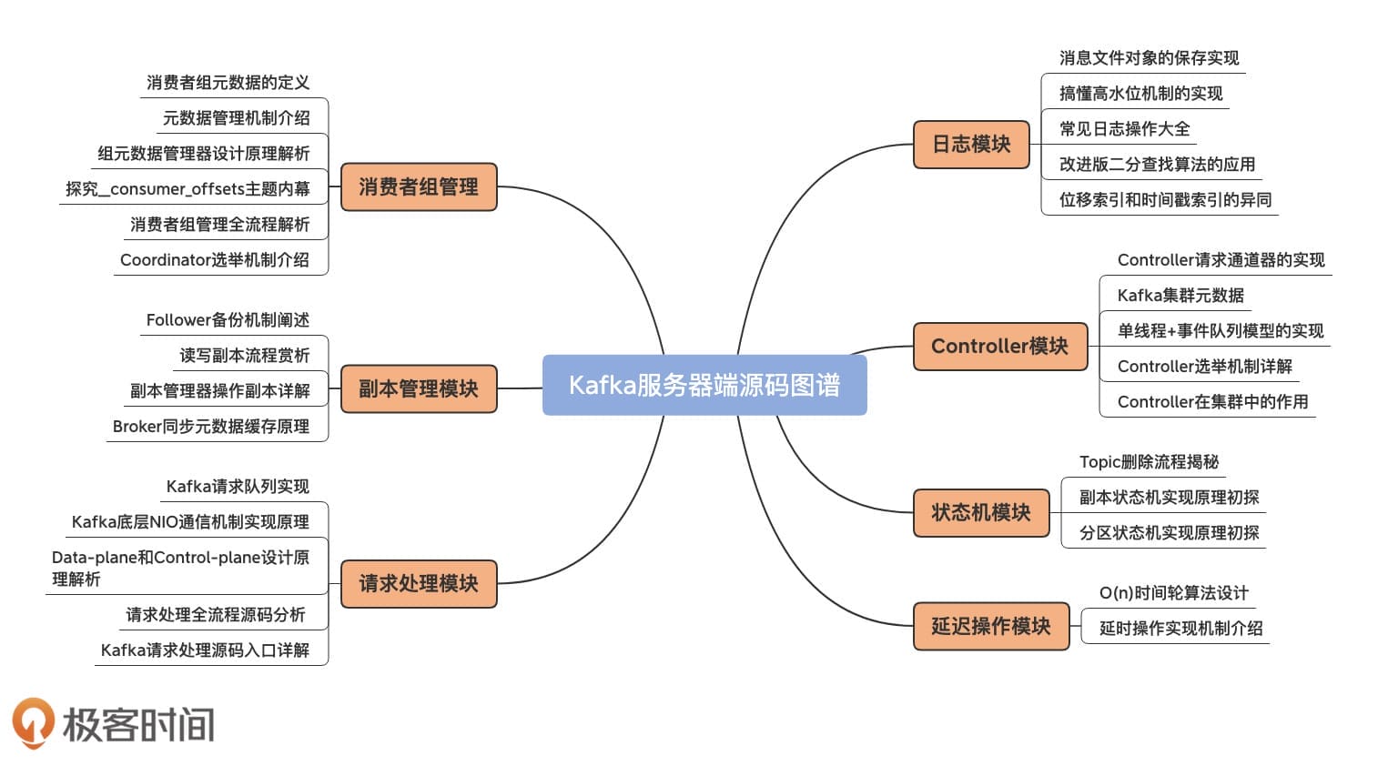 我把服务器端源码按照功能划分了7个模块,每个模块会进一步划开多个子部分,详细地给出各个组件级的源码分析。你可以看下这张思维导图的重点介绍。