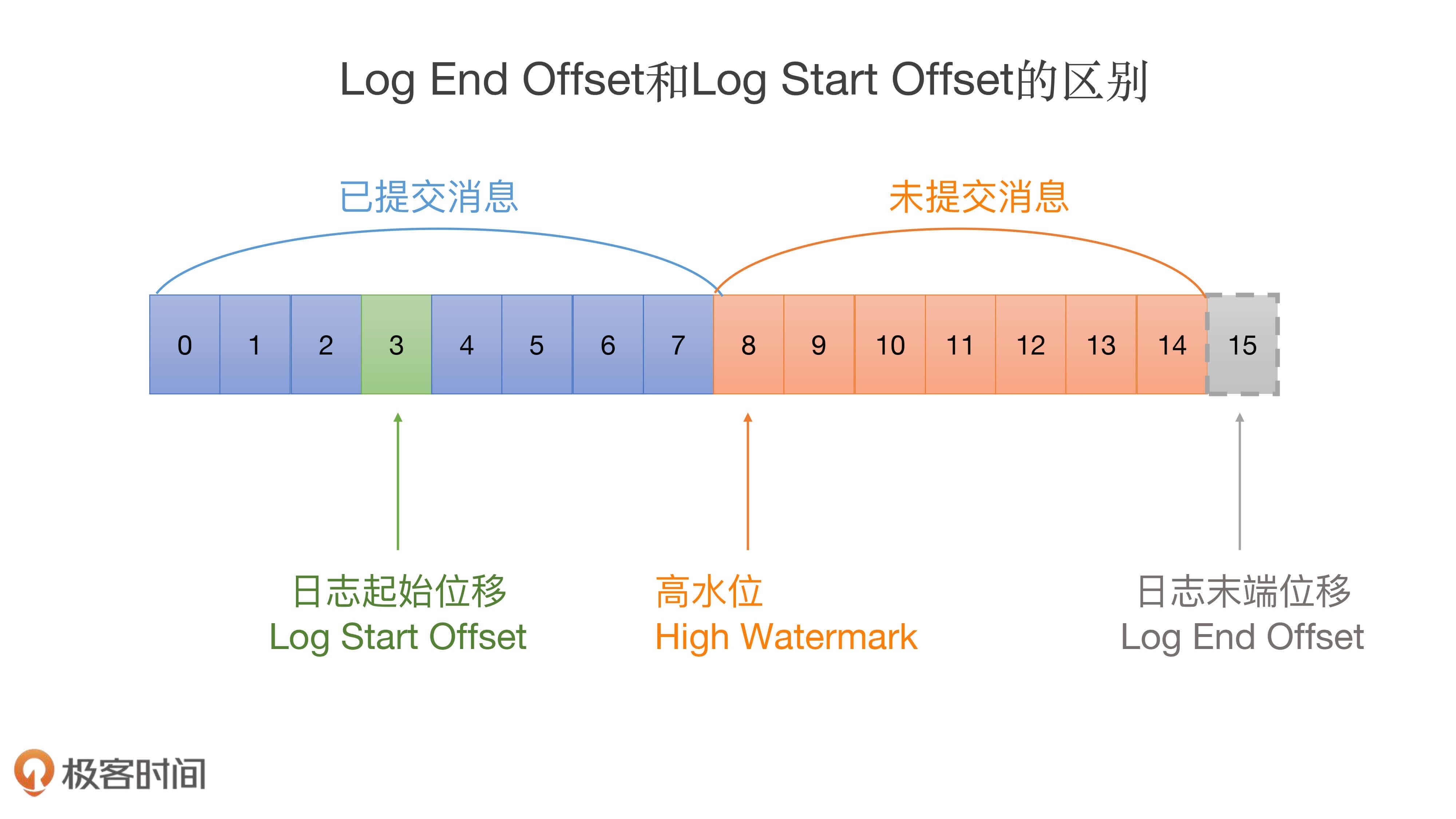 图中绿色的位移值3是日志的Log Start Offset,而位移值15表示LEO。另外,位移值8是高水位值,它是区分已提交消息和未提交消息的分水岭。