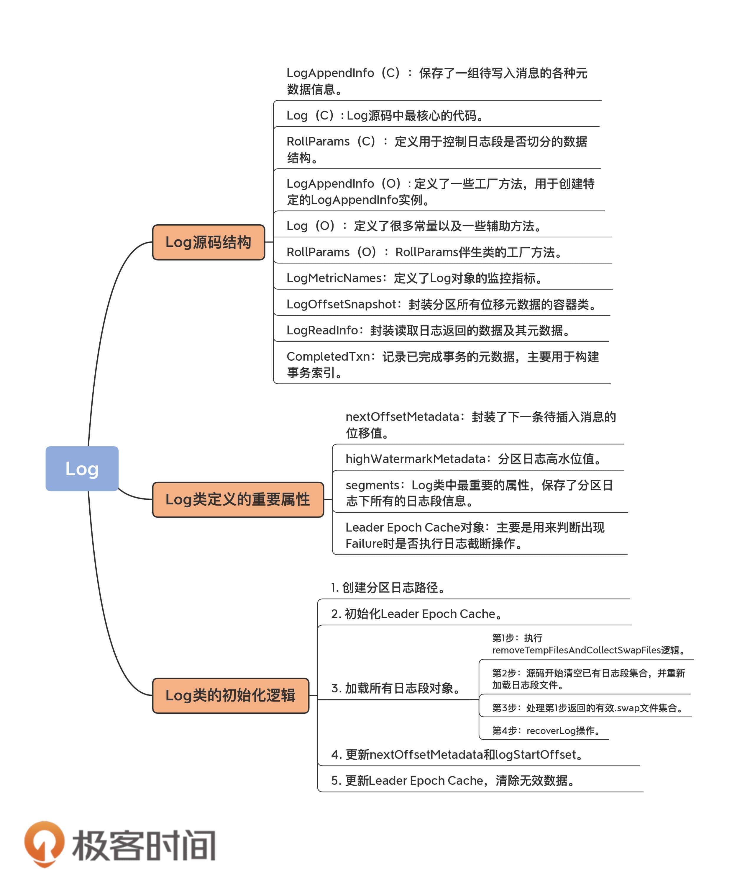 Log类的其他属性你暂时不用理会,因为它们要么是很明显的工具类属性,比如timer和scheduler,要么是高阶用法才会用到的高级属性,比如producerStateManager和logDirFailureChannel。工具类的代码大多是做辅助用的,跳过它们也不妨碍我们理解Kafka的核心功能;而高阶功能代码设计复杂,学习成本高,性价比不高。