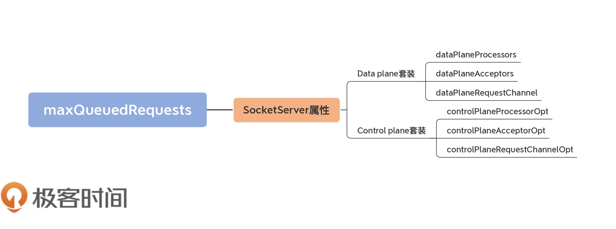 但是,一旦你开启了Control plane设置,其Processor线程就只有1个,Acceptor线程也是1个。另外,你要注意,它对应的RequestChannel里面的请求队列长度被硬编码成了20,而不是一个可配置的值。这揭示了社区在这里所做的一个假设:即控制类请求的数量应该远远小于数据类请求,因而不需要为它创建线程池和较深的请求队列。