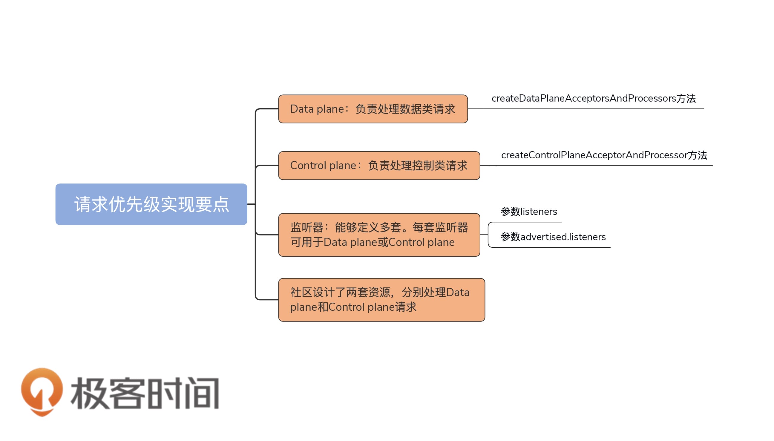 好了,我们来小结一下。今天,我们重点学习了社区实现不同类型请求优先级的方法。结合监听器的概念,我们深入到SocketServer的源码中,分析了Data plane和Control plane的实现原理。我们来回顾一下这节课的重点。