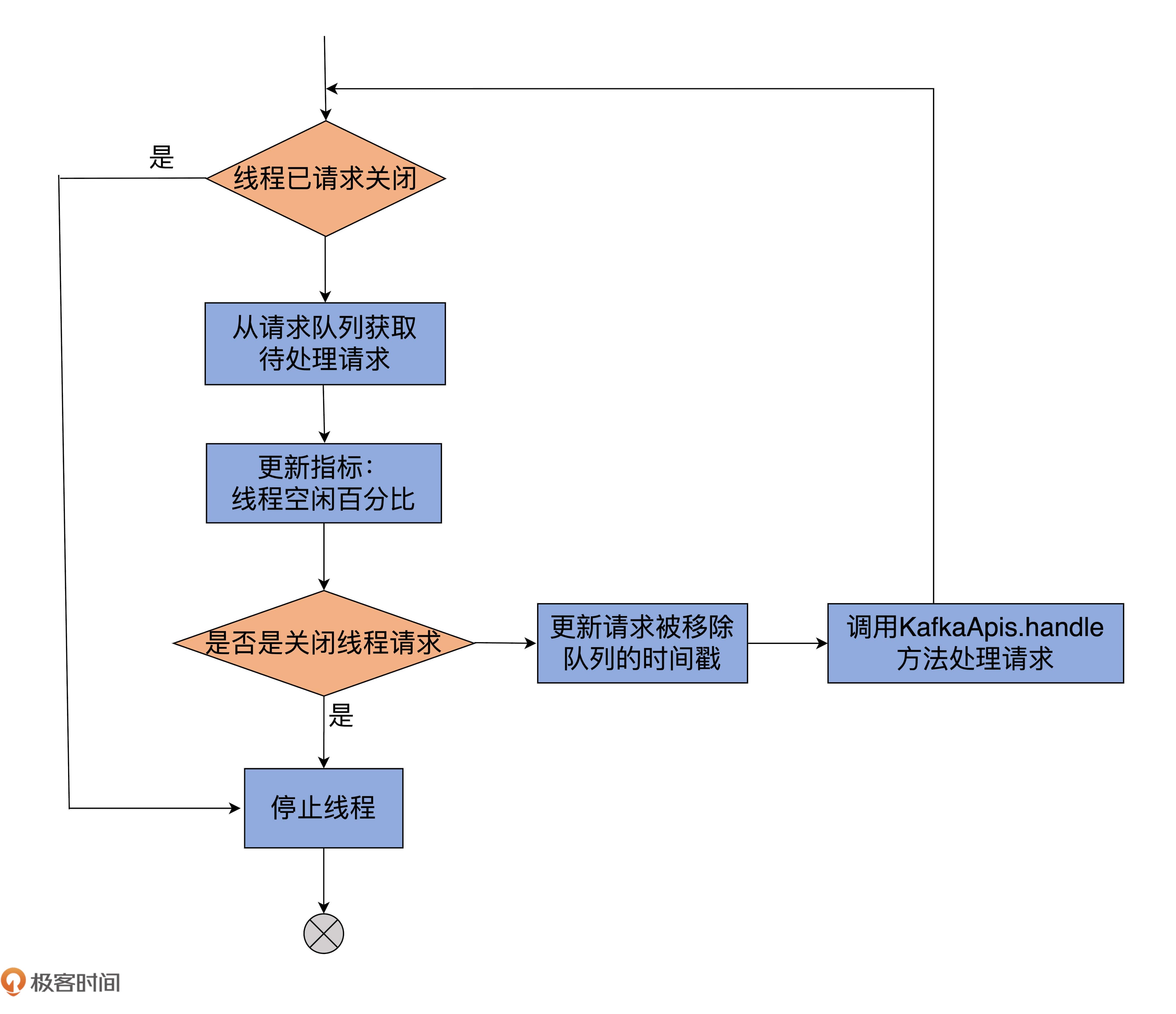 虽然我给一些主要的代码都标记了注释,但为了方便你更好地理解,我画一张图,借助它来展示下KafkaRequestHandler线程的处理逻辑: