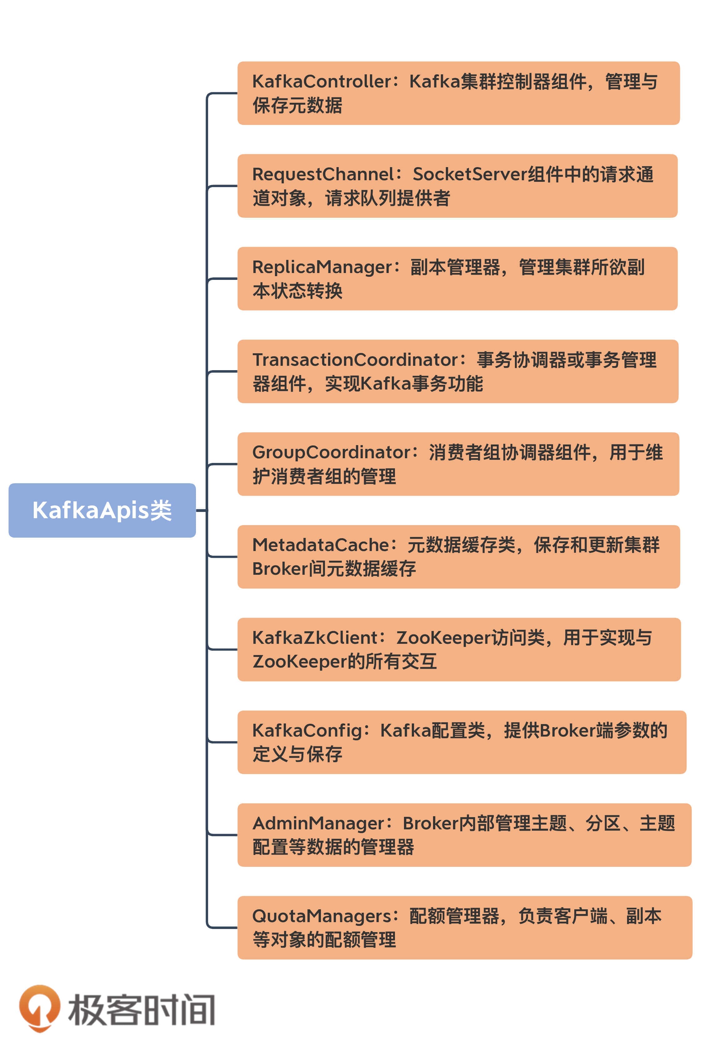 从这张图可以看出,KafkaApis下可谓是大牌云集。放眼整个源码工程,KafkaApis关联的“大佬级”组件都是最多的!在KafkaApis中,你几乎能找到Kafka所有重量级的组件,比如,负责副本管理的ReplicaManager、维护消费者组的GroupCoordinator以及操作Controller组件的KafkaController,等等。