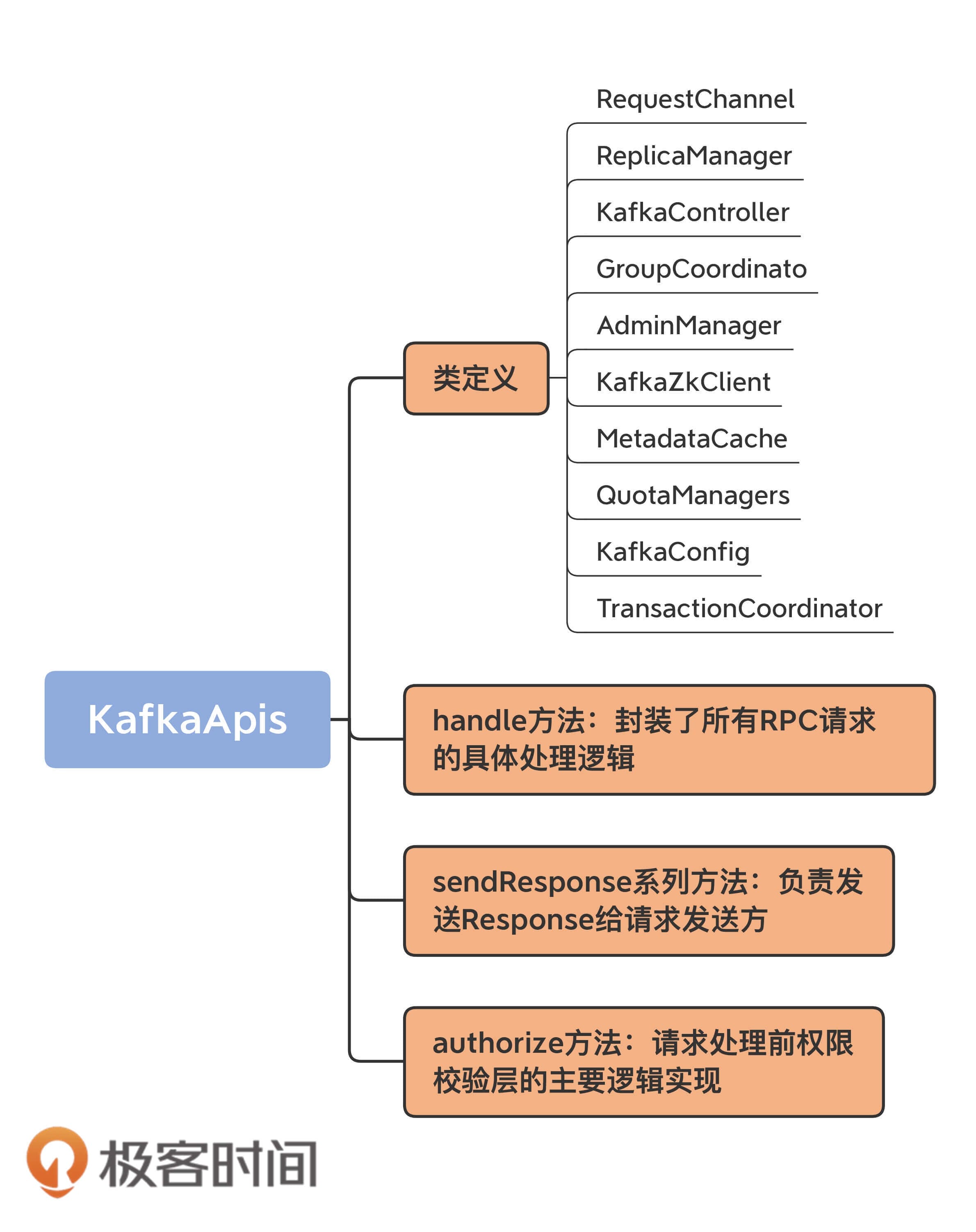 在处理不同类型的RPC请求时,KafkaApis会用到不同的组件,因此,在创建KafkaApis实例时,我们必须把可能用到的组件一并传给它,这也是它汇聚众多大牌组件于一身的原因。