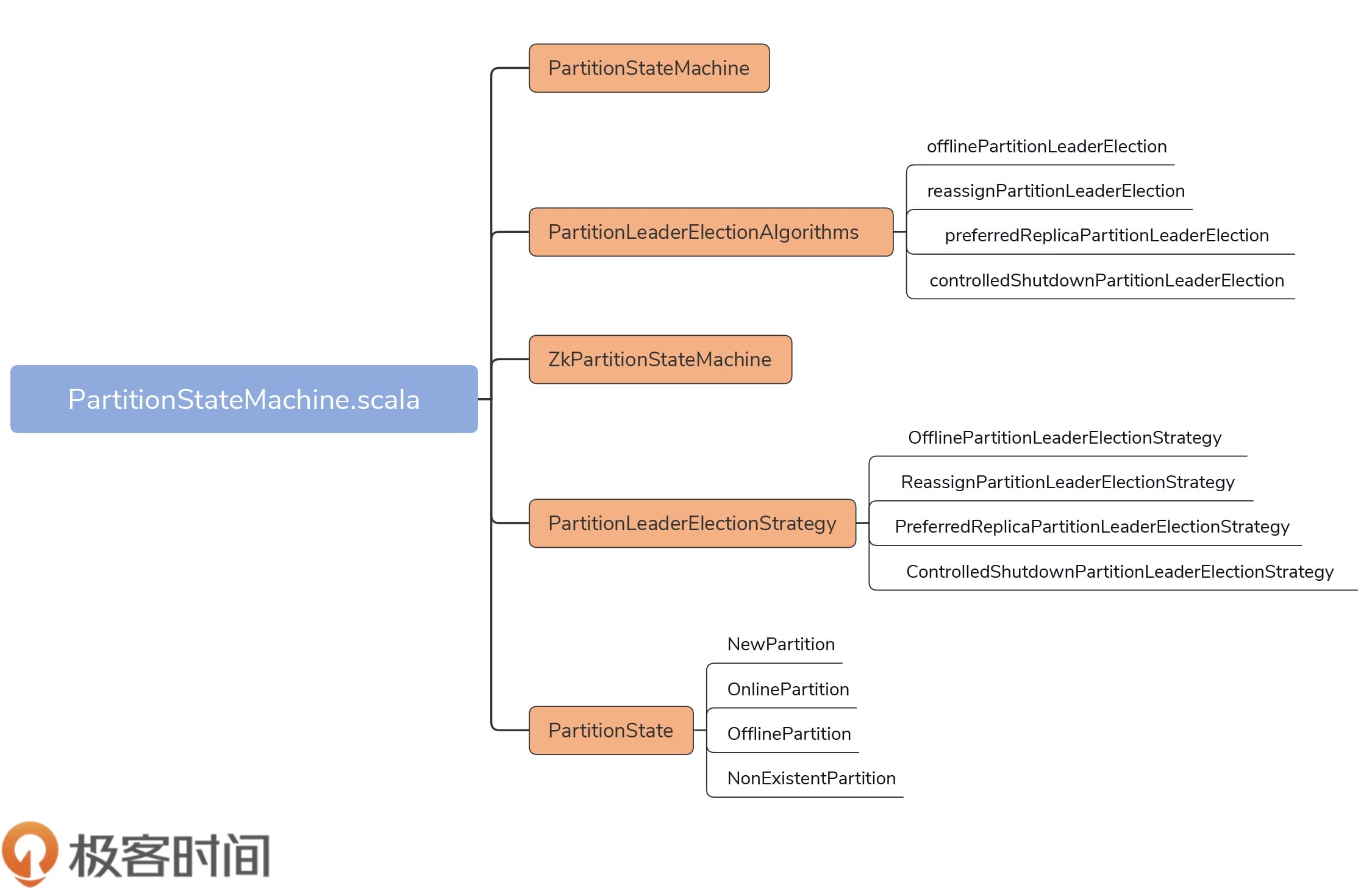 PartitionStateMachine.scala文件位于controller包下,代码结构不复杂,可以看下这张思维导图: