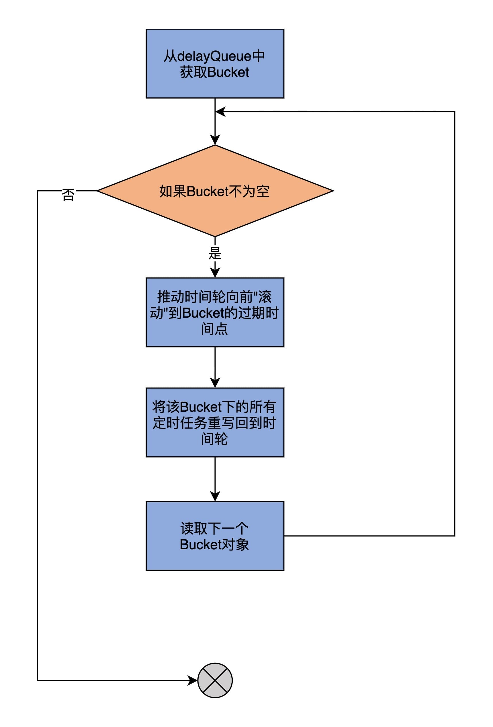 advanceClock方法要做的事情,就是遍历delayQueue中的所有Bucket,并将时间轮的时钟依次推进到它们的过期时间点,令它们过期。然后,再将这些Bucket下的所有定时任务全部重新插入回时间轮。