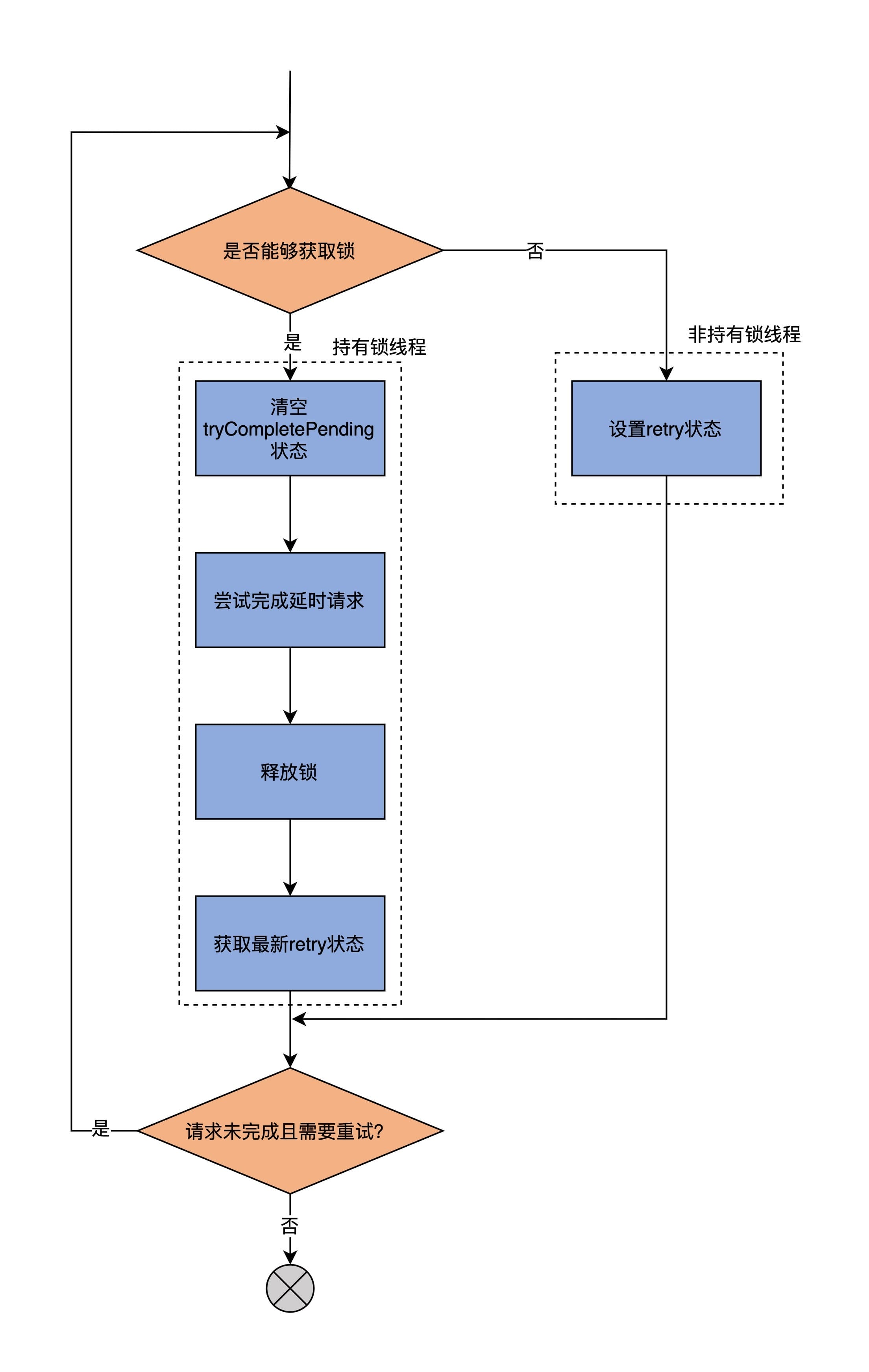 如果拿到锁对象,就依次执行清空tryCompletePending状态、完成延迟请求、释放锁以及读取最新retry状态的动作。未拿到锁的线程,就只能设置tryCompletePending状态,来间接影响retry值,从而给获取到锁的线程一个重试的机会。这里的重试,是通过do…while循环的方式实现的。