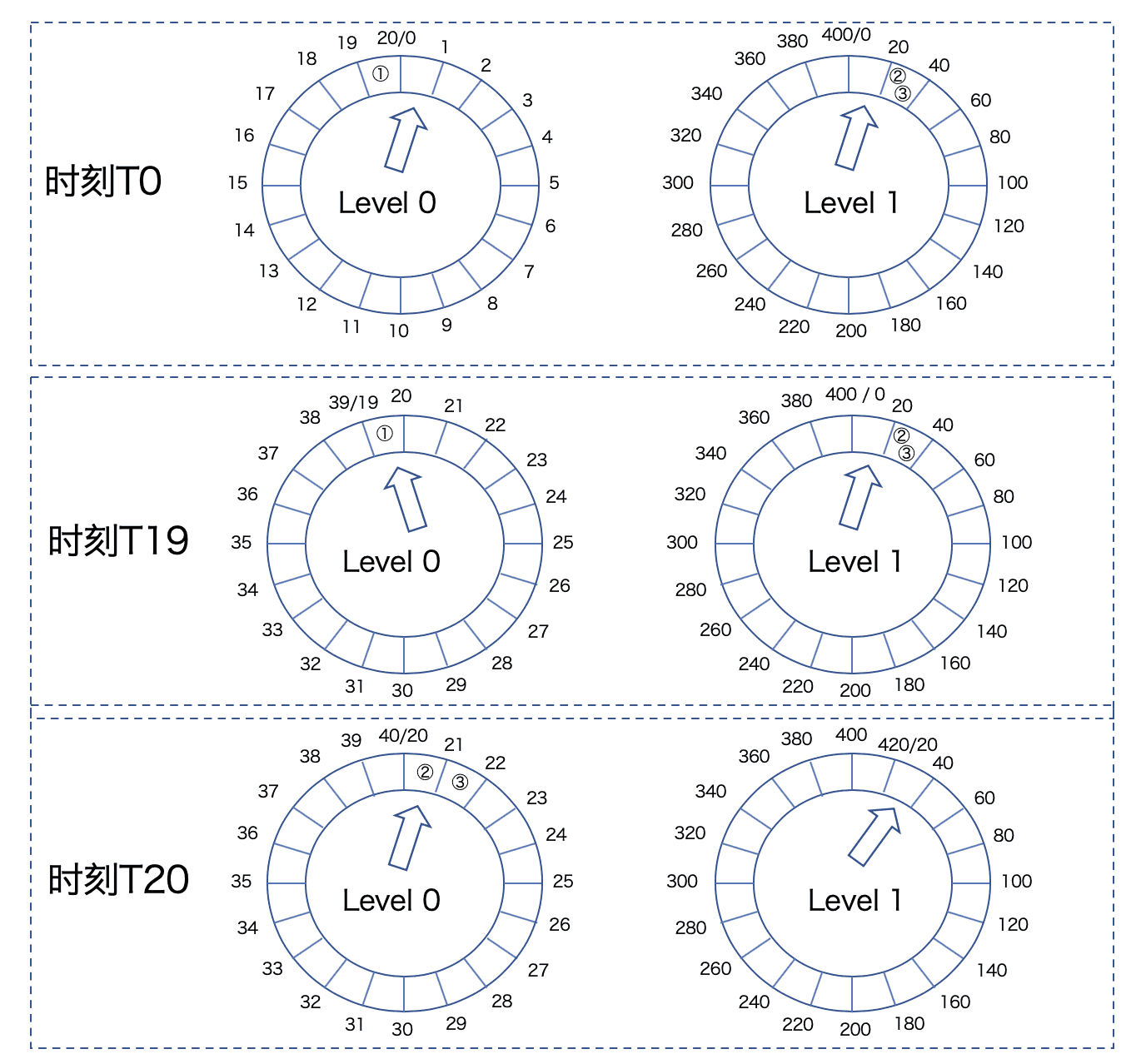 基于这种设计,每个延迟请求需要根据自己的超时时间,来决定它要被保存于哪一层时间轮上。我们假设在t=0时创建了第1层的时间轮,那么,该层第1个Bucket保存的延迟请求就是介于[0,1)之间,第2个Bucket保存的是介于[1,2)之间的请求。现在,如果有两个延迟请求,超时时刻分别在18.5毫秒和123毫秒,那么,第1个请求就应该被保存在第1层的第19个Bucket(序号从1开始)中,而第2个请求,则应该被保存在第2层时间轮的第6个Bucket中。