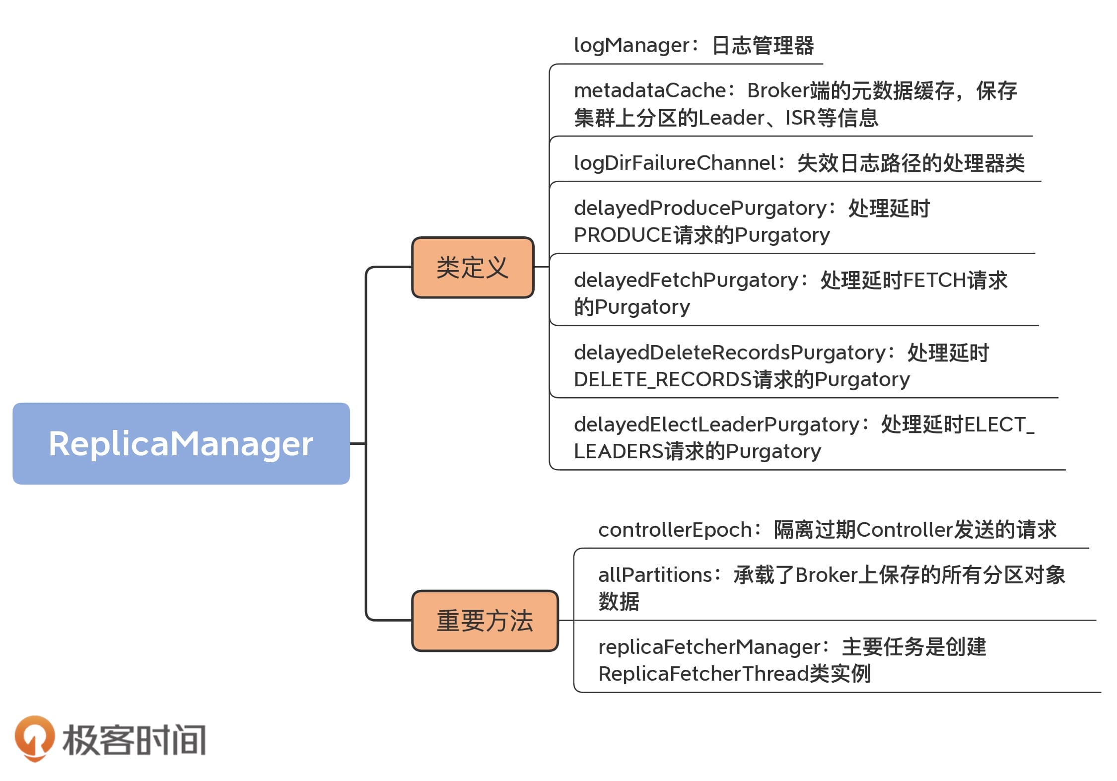 你一定还记得,前面讲到状态机的时候,我说过,Kafka同时实现了副本状态机和分区状态机。但对于管理器而言,Kafka源码却没有专门针对分区,定义一个类似于“分区管理器”这样的类,而是只定义了ReplicaManager类。该类不只实现了对副本的管理,还包含了很多操作分区对象的方法。