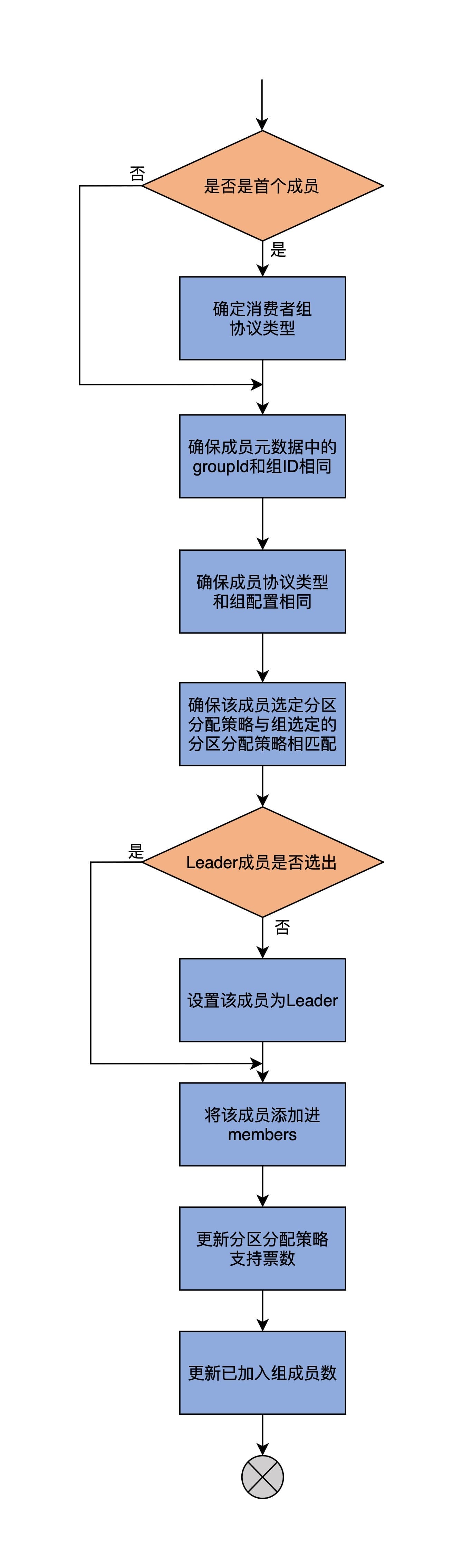 第二步,add方法会连续进行三次校验,分别确保待添加成员的组ID、protocolType和组配置一致,以及该成员选定的分区分配策略与组选定的分区分配策略相匹配。如果这些校验有任何一个未通过,就会立即抛出异常。