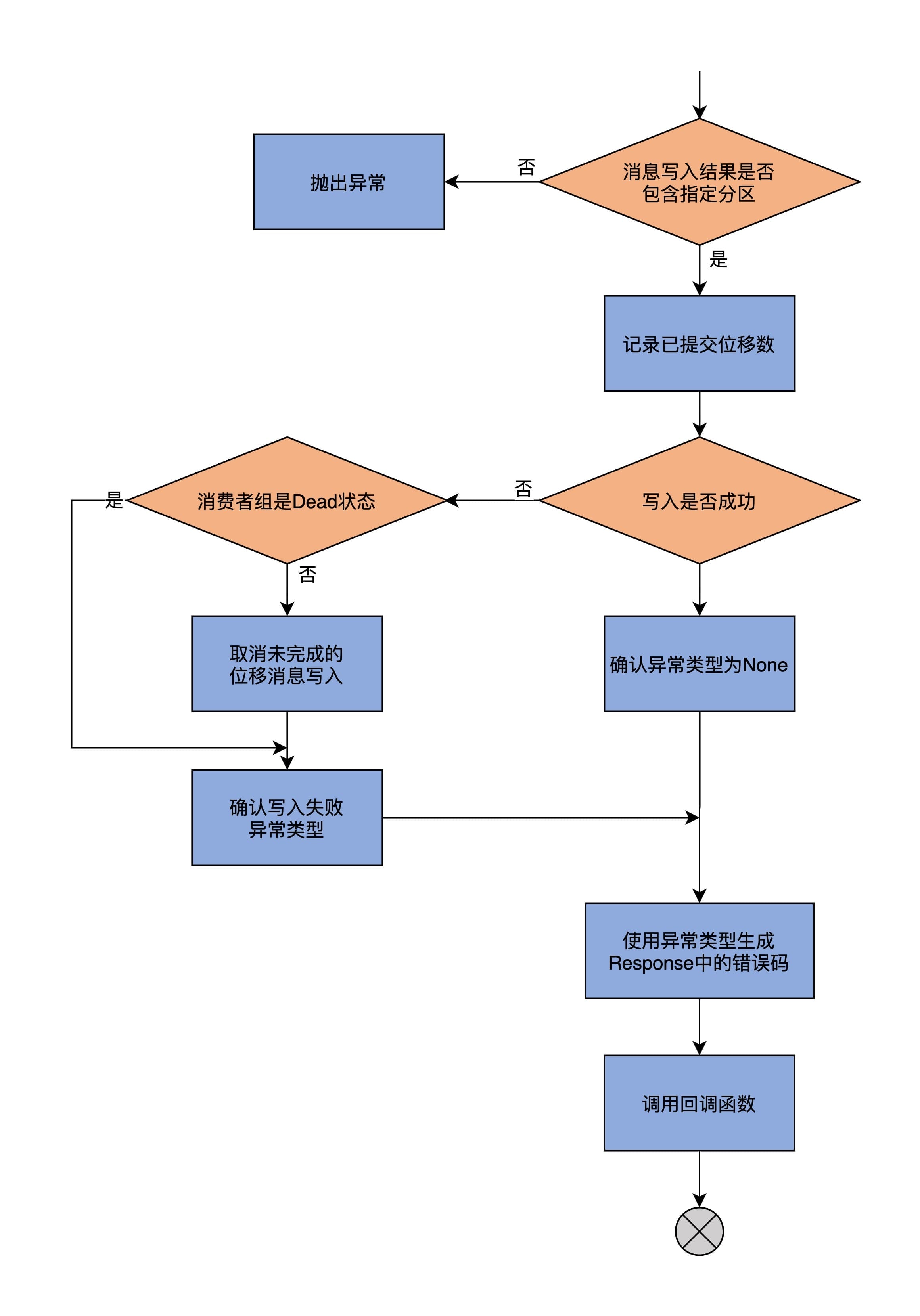 接下来,代码要将日志写入的异常类型转换成表征提交状态错误的异常类型。具体来说,就是将UNKNOWN_TOPIC_OR_PARTITION、NOT_LEADER_FOR_PARTITION和MESSAGE_TOO_LARGE这样的异常,转换到COORDINATOR_NOT_AVAILABLE和NOT_COORDINATOR这样的异常。之后,再将这些转换后的异常封装进commitStatus字段中传给回调函数。
