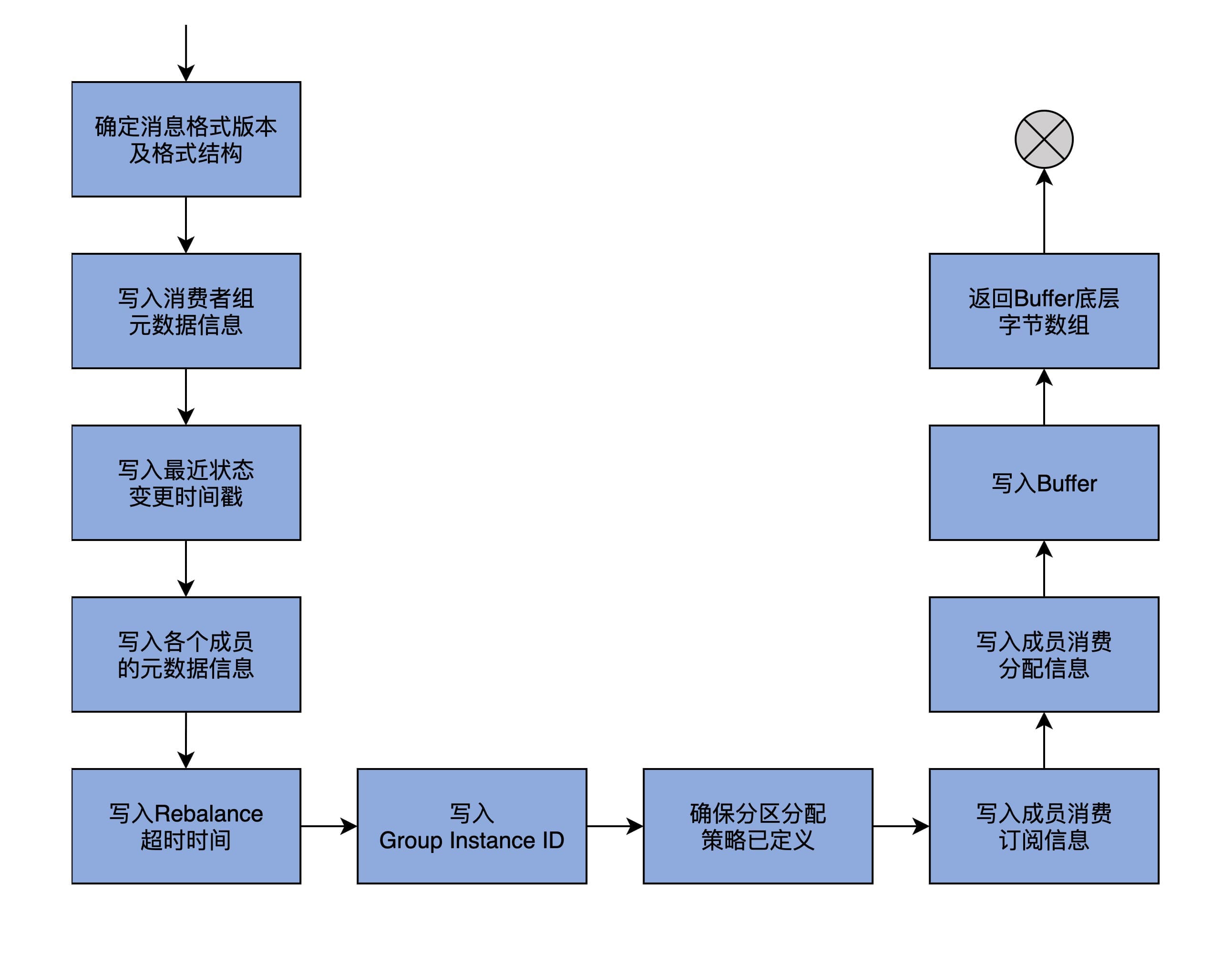 该方法首先会接收消费者组名,构造ByteBuffer对象,然后,依次向Buffer写入Short型的消息格式版本以及消费者组名,最后,返回该Buffer底层的字节数组。