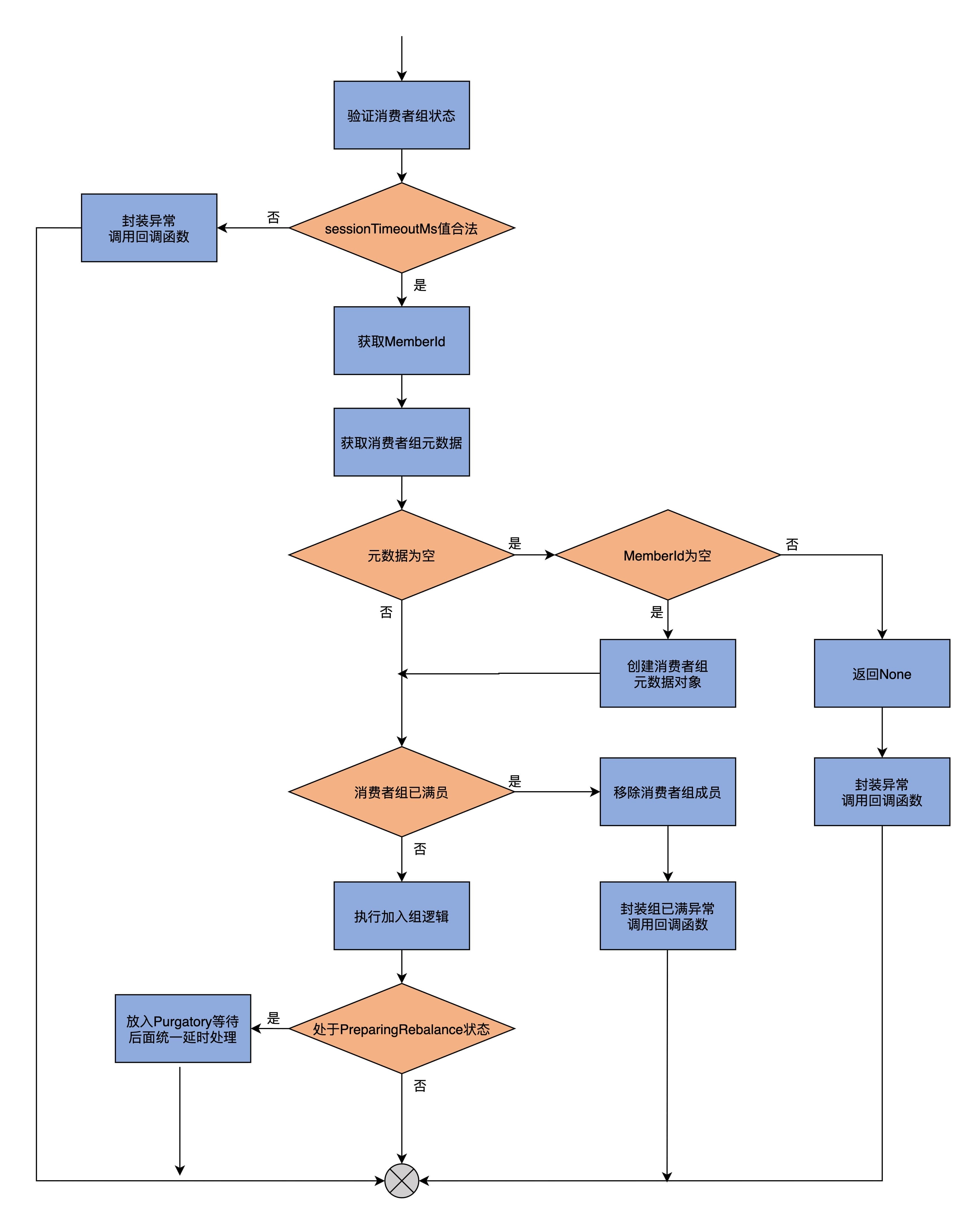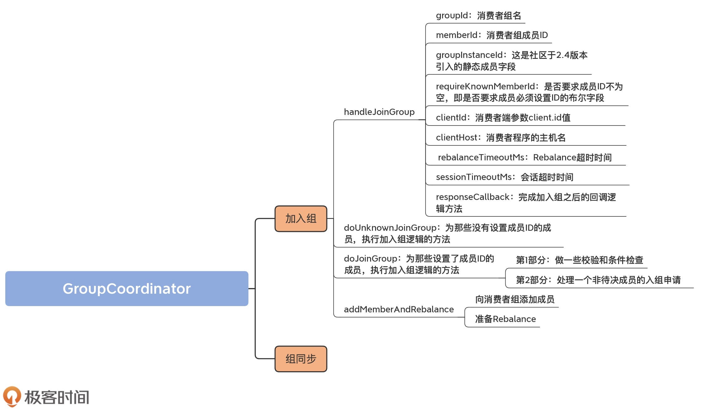 接下来,我们看下doJoinGroup方法。这是为那些设置了成员ID的成员,执行加入组逻辑的方法。它的输入参数全部承袭自handleJoinGroup方法输入参数,你应该已经很熟悉了,因此,我们直接看它的源码实现。由于代码比较长,我分成两个部分来介绍。同时,我再画一张图,帮助你理解整个方法的逻辑。