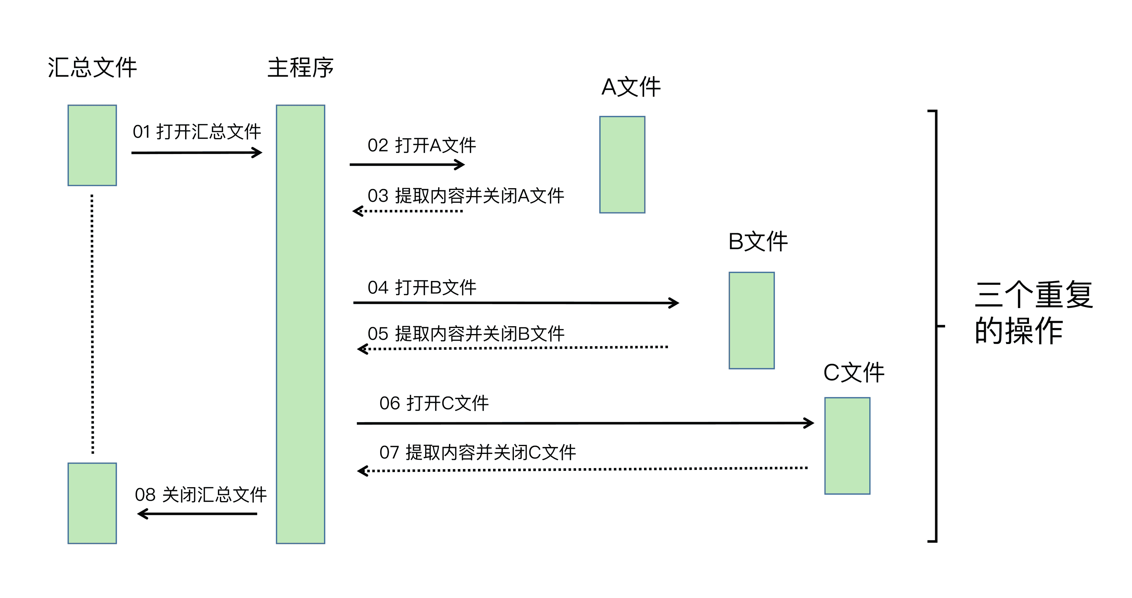 在这段代码中,Excel的读取和写入操作、for循环操作都派上了用场,它的整个工作过程就像我画的时序图一样:先打开用来汇总的Excel文件,依次对多个调查问卷进行读取,最后逐行写入到新建立的汇总文件中。