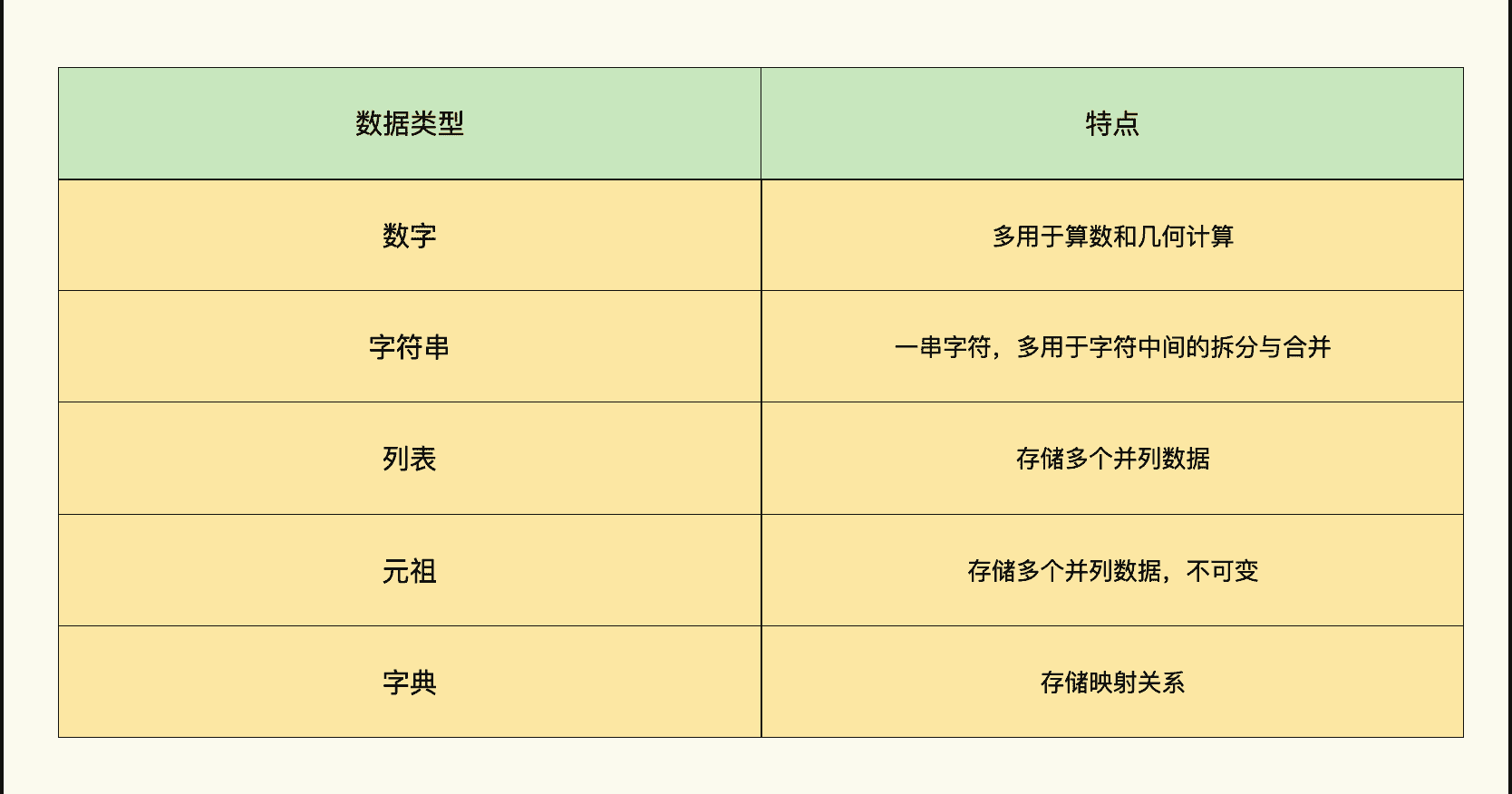 好了,掌握了python支持的五种数据类型,以及它们各自的适用场景,我把它们的特点总结在下面的表格。