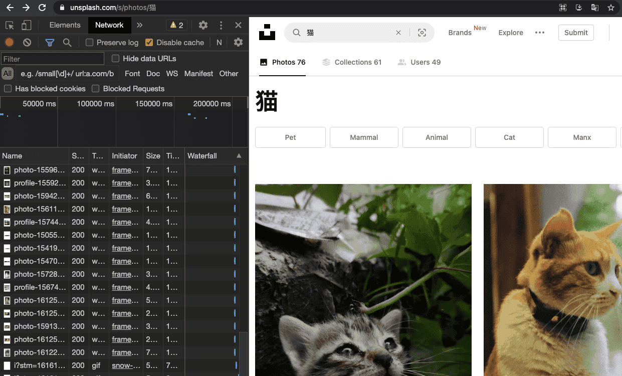 你可以使用浏览器访问 “https://unsplash.com/s/photos/猫” URL后,再通过浏览器的调试功能,打开调试界面。我以最流行的Chrome浏览器为例,它的调试窗口打开快捷键是“F12”,打开调试界面后的截图如下,供你参考: