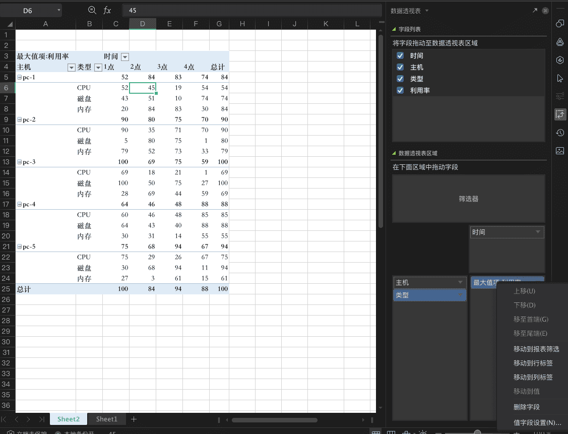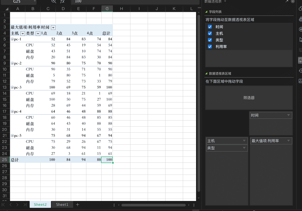 在截图的左侧是透视表的结果,而右侧就是透视表的控制区域,你需要根据自己的分析需求,把字段拖入到右下角的“透视表区域”,包括“行、列、值”三个方框。例如我希望得到每台电脑的CPU、内存、磁盘在每小时和每天最大利用率,就可以把“主机、类型”字段拖入“列”,把“时间”字段拖入“行”,把“利用率”字段拖入“值”。