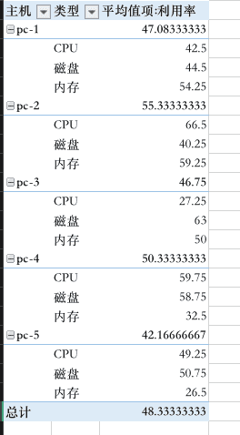 那么我在这里用数据透视表提供两种将数据组合起来有意义的结果,它们是每台电脑每小时各种资源利用率的最大值,以及每台电脑每天资源利用率的平均值。