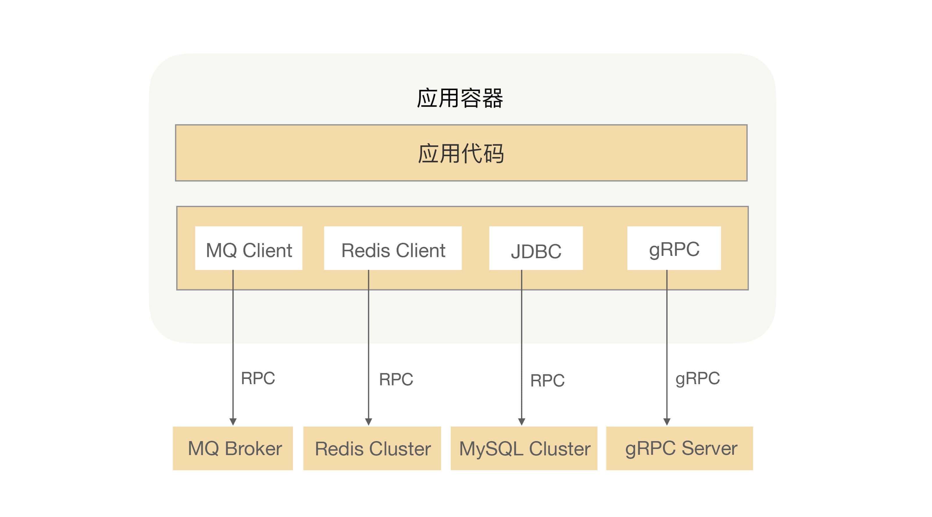 在这个应用中,我使用了MQ来处理异步流程、Redis缓存热点数据、MySQL持久化数据,还有就是在系统中调用另外一个业务系统的接口,对我的应用来说这些都是属于RPC调用,而MQ、MySQL持久化的数据也会存在于一个分布式文件系统中,他们之间的调用也是需要用RPC来完成数据交互的。