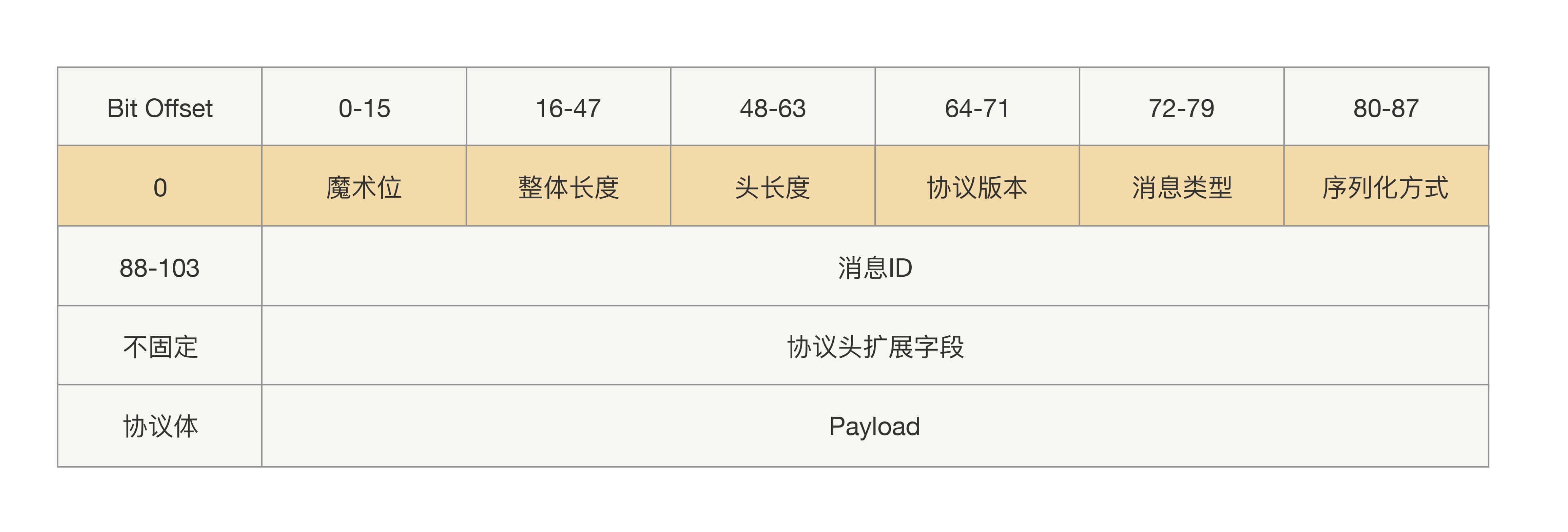 所以为了保证能平滑地升级改造前后的协议,我们有必要设计一种支持可扩展的协议。其关键在于让协议头支持可扩展,扩展后协议头的长度就不能定长了。那要实现读取不定长的协议头里面的内容,在这之前肯定需要一个固定的地方读取长度,所以我们需要一个固定的写入协议头的长度。整体协议就变成了三部分内容:固定部分、协议头内容、协议体内容,前两部分我们还是可以统称为“协议头”,具体协议如下: