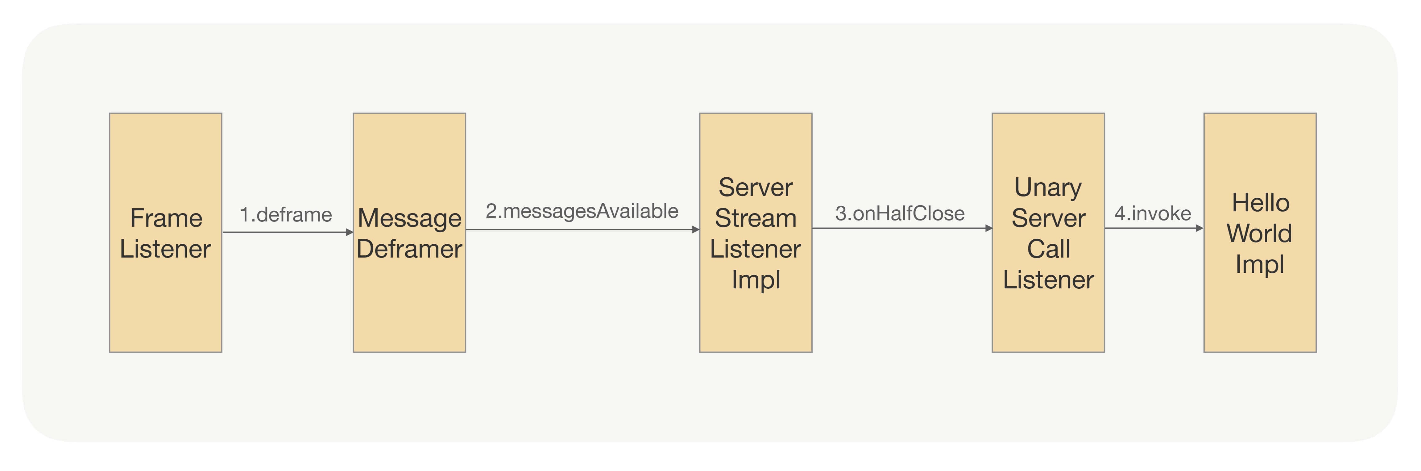 在收到 Header 或者 Body 二进制数据后,NettyServerHandler 上绑定的FrameListener 会把这些二进制数据转到 MessageDeframer 里面,从而实现 gRPC 协议消息的解析 。