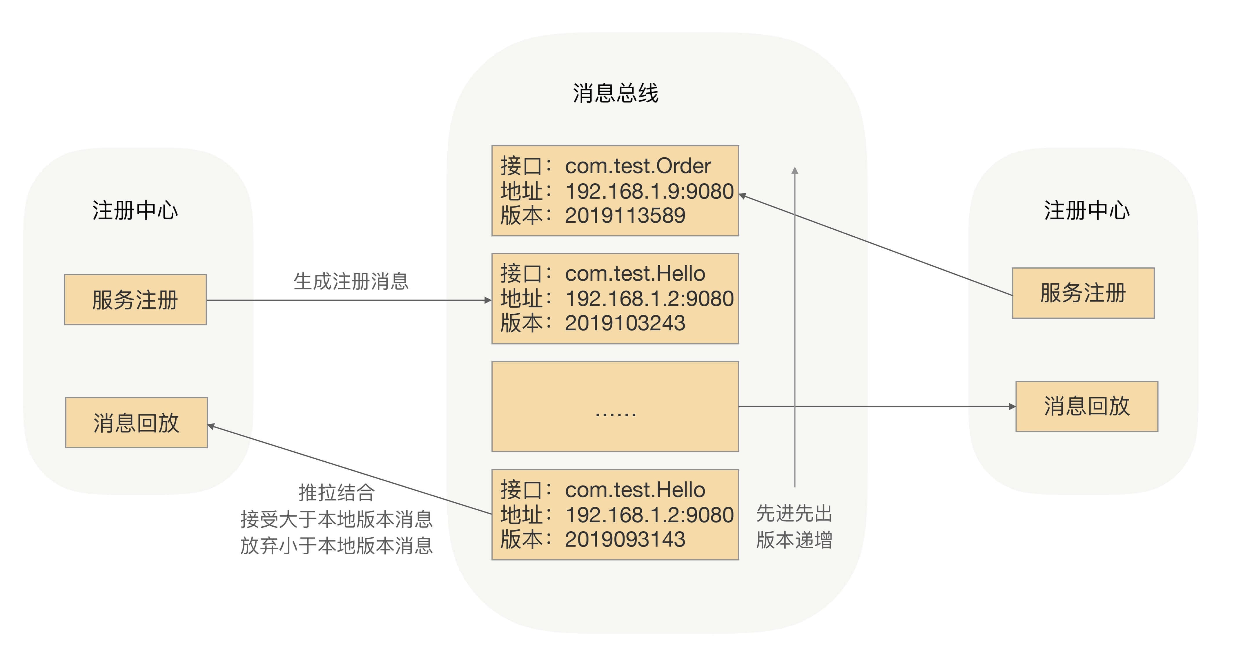 RPC框架依赖的注册中心的服务数据的一致性其实并不需要满足CP,只要满足AP即可。我们就是采用“消息总线”的通知机制,来保证注册中心数据的最终一致性,来解决这些问题的。