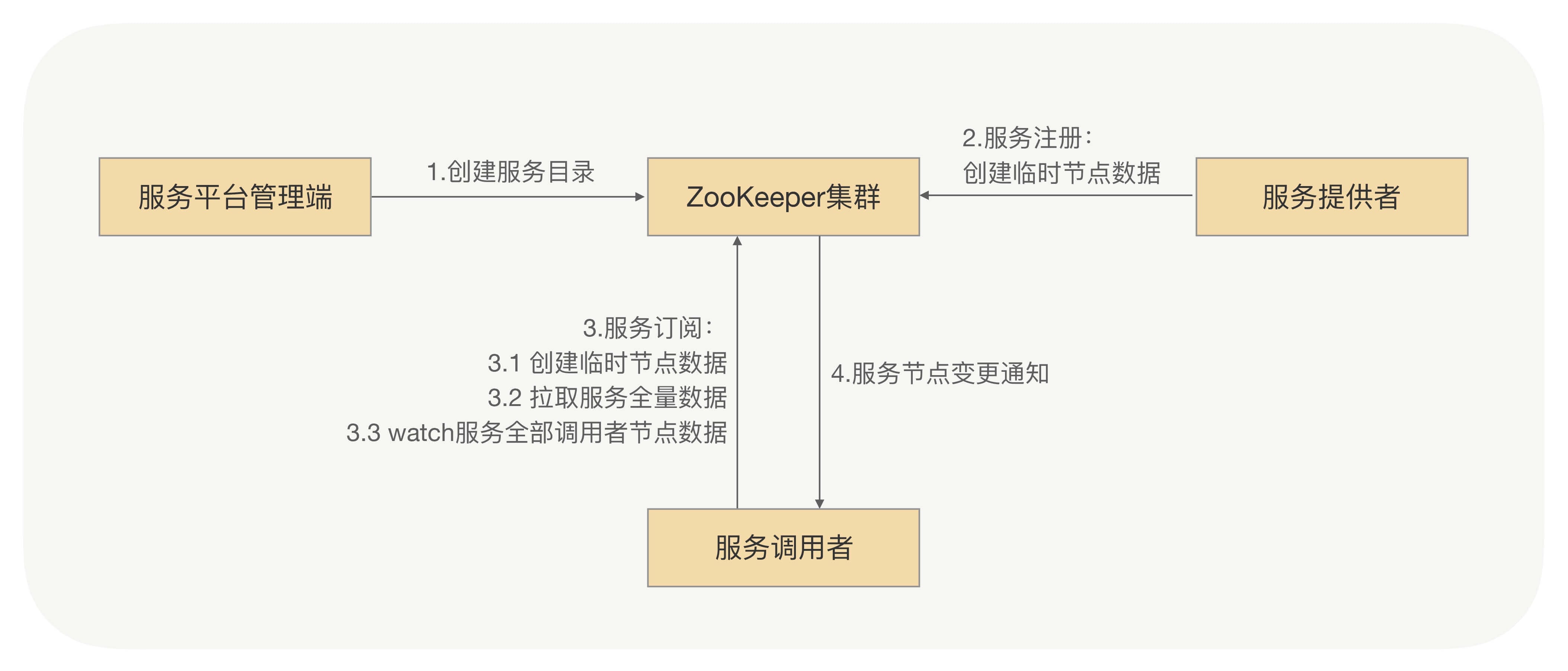 整体的思路很简单,就是搭建一个ZooKeeper集群作为注册中心集群,服务注册的时候只需要服务节点向ZooKeeper节点写入注册信息即可,利用ZooKeeper的Watcher机制完成服务订阅与服务下发功能,整体流程如下图: