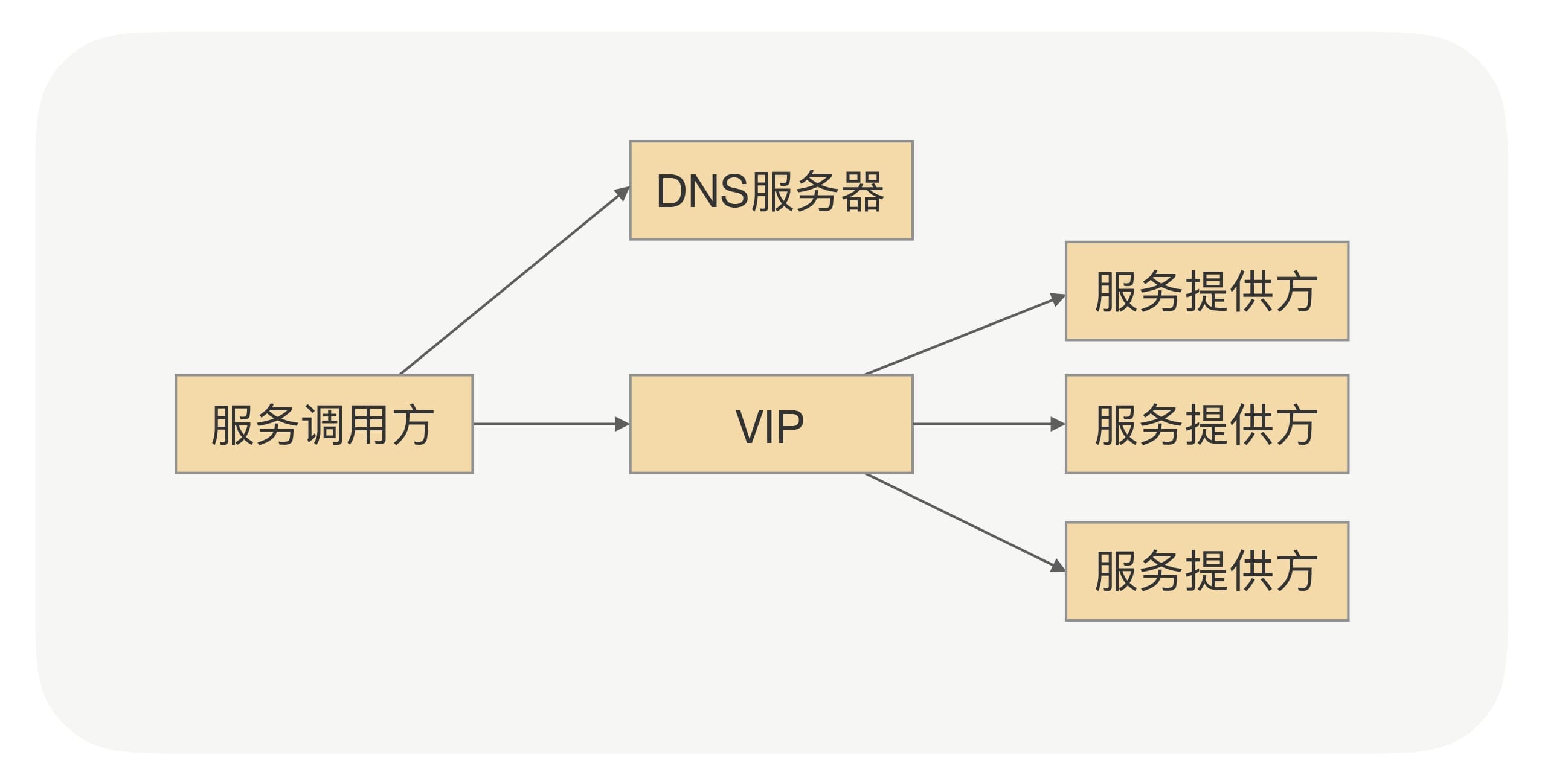 这时你可能会想,我是不是可以加一个负载均衡设备呢?将域名绑定到这台负载均衡设备上,通过DNS拿到负载均衡的IP。这样服务调用的时候,服务调用方就可以直接跟VIP建立连接,然后由VIP机器完成TCP转发,如下图所示: