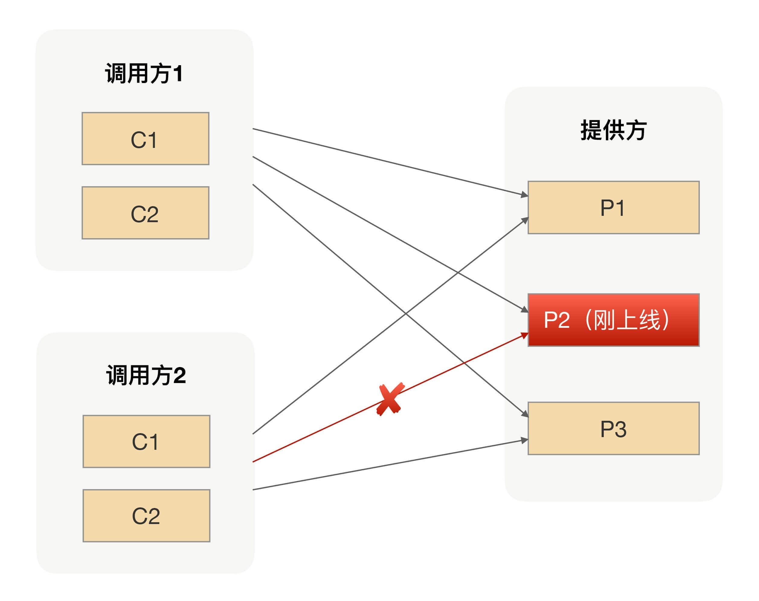 那如果没法100%规避风险,我们还能怎么办?我认为只有一条路可以尝试了,就是尽量减小上线出问题导致业务受损的范围。基于这个思路,我们是不是可以在上线完成后,先让一小部分调用方请求过来进行逻辑验证,待没问题后再接入其他调用方,从而实现流量隔离的效果。那在RPC框架里面我们具体该怎么实现呢?