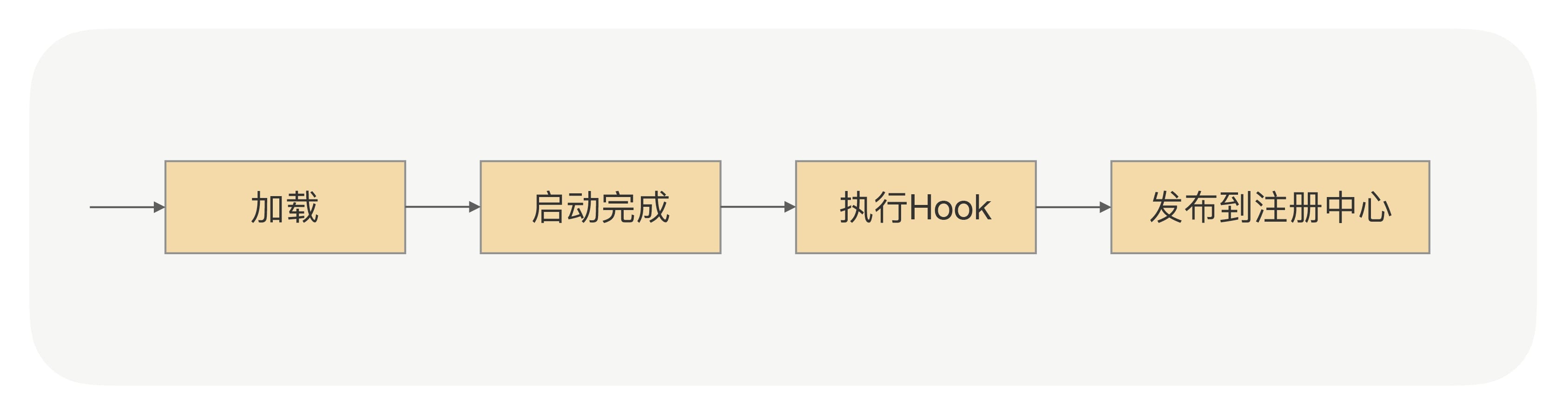 我们还是需要利用服务提供方把接口注册到注册中心的那段时间。我们可以在服务提供方应用启动后,接口注册到注册中心前,预留一个Hook过程,让用户可以实现可扩展的Hook逻辑。用户可以在Hook里面模拟调用逻辑,从而使JVM指令能够预热起来,并且用户也可以在Hook里面事先预加载一些资源,只有等所有的资源都加载完成后,最后才把接口注册到注册中心。整个应用启动过程如下图所示: