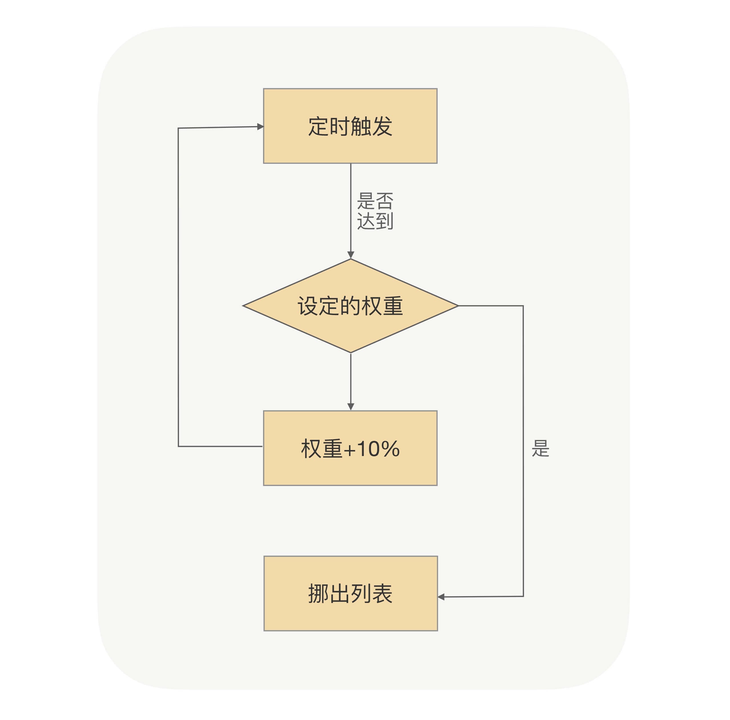 不管你是选择哪个时间,最终的结果就是,调用方通过服务发现,除了可以拿到IP列表,还可以拿到对应的启动时间。我们需要把这个时间作用在负载均衡上,在[第 11 讲] 我们介绍过一种基于权重的负载均衡,但是这个权重是由服务提供方设置的,属于一个固定状态。现在我们要让这个权重变成动态的,并且是随着时间的推移慢慢增加到服务提供方设定的固定值,整个过程如下图所示: