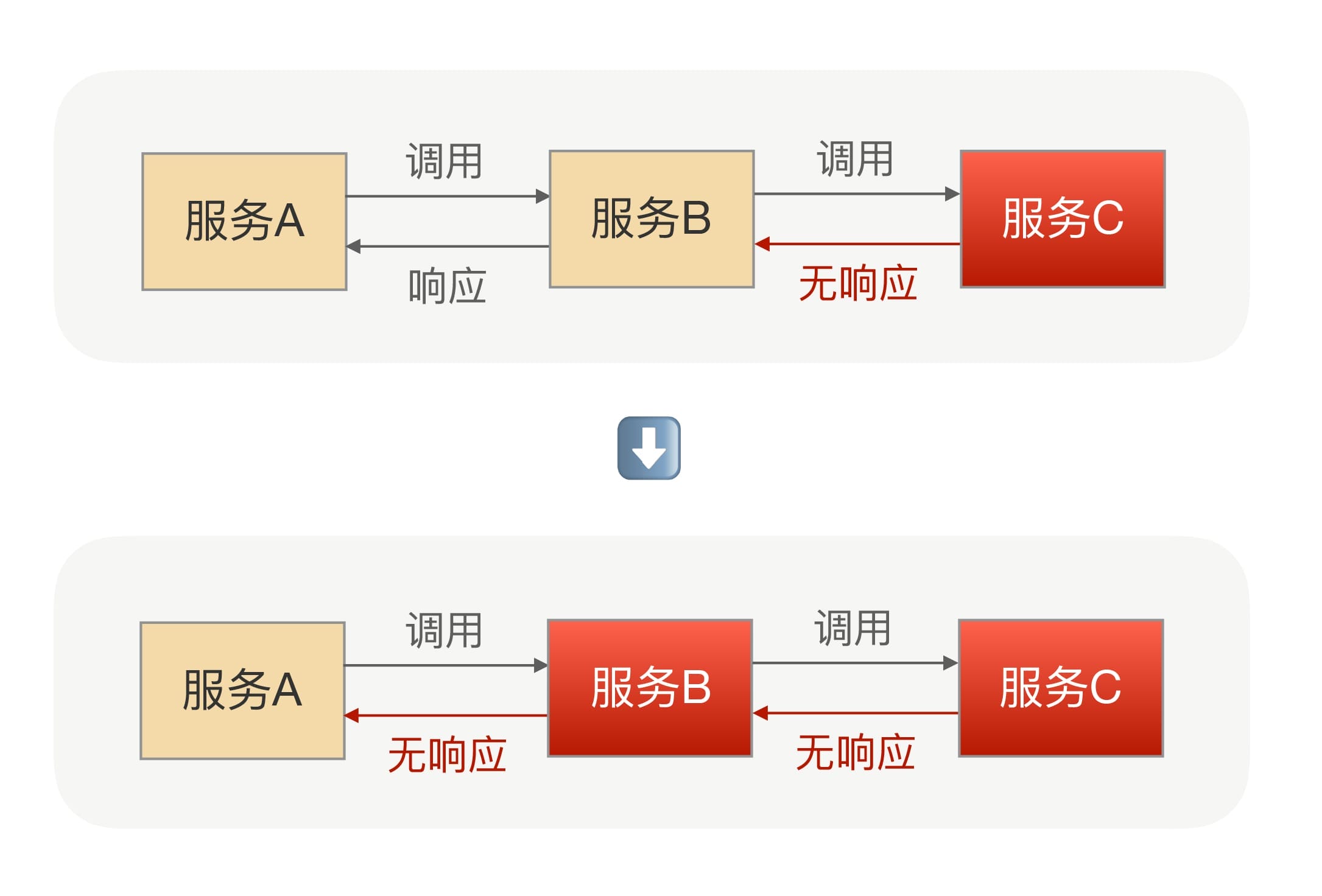 举个例子,假如我要发布一个服务B,而服务B又依赖服务C,当一个服务A来调用服务B时,服务B的业务逻辑调用服务C,而这时服务C响应超时了,由于服务B依赖服务C,C超时直接导致B的业务逻辑一直等待,而这个时候服务A在频繁地调用服务B,服务B就可能会因为堆积大量的请求而导致服务宕机。