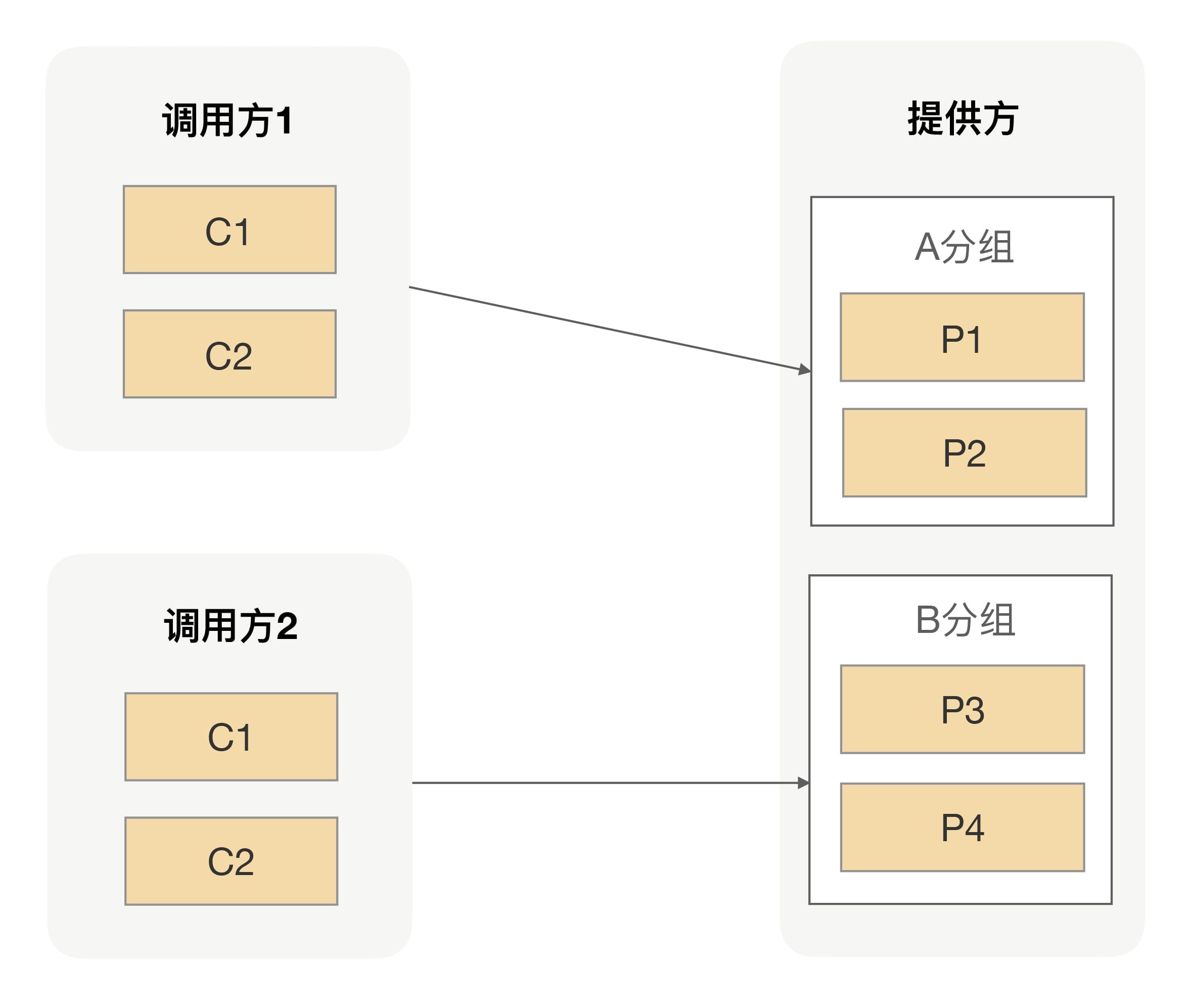 非核心应用不要跟核心应用分在同一个组,核心应用之间应该做好隔离,一个重要的原则就是保障核心应用不受影响。比如提供给电商下单过程中用的商品信息接口,我们肯定是需要独立出一个单独分组,避免受其它调用方污染的。有了分组之后,我们的服务调用方跟服务提供方之间的调用拓扑就如下图所示: