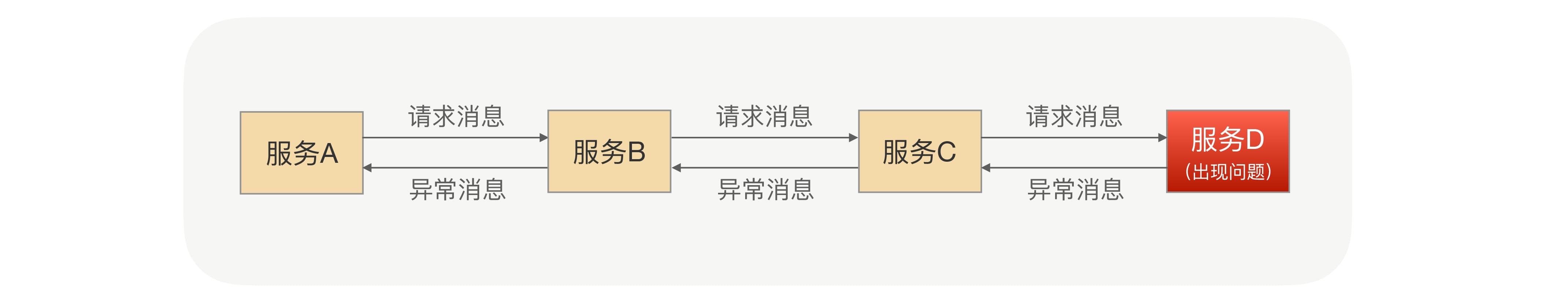 假设这4个服务分别由来自不同部门的4个同事维护,在A调用B的时候,维护服务A的同事可能是不知道存在服务C和服务D的,对于服务A来说,它的下游服务只有B服务,那这时如果服务C或服务D出现异常,最终在整个链路中将异常抛给A了呢?
