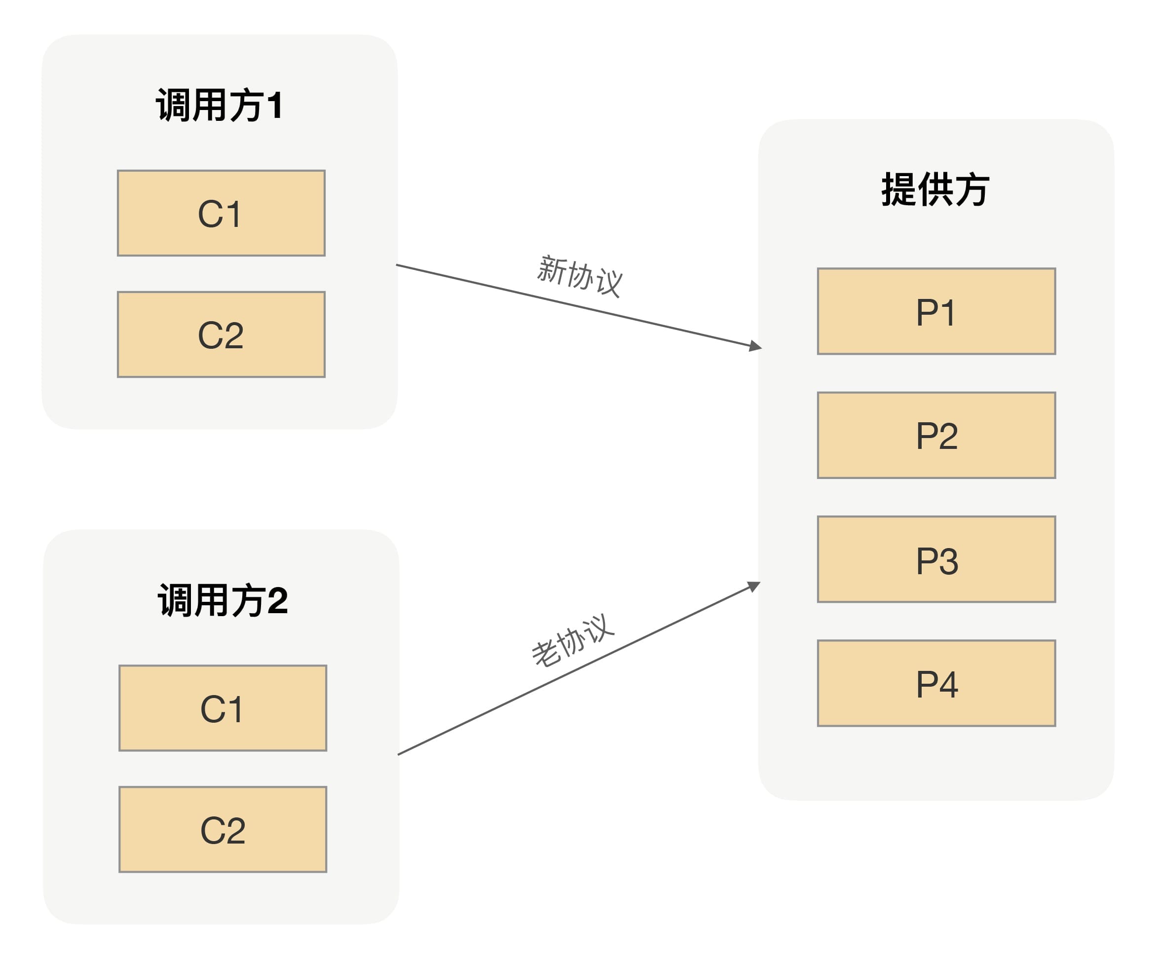 那有没有更好的方式可以让应用上线一次就可以完成新老RPC的切换呢?关键就在于要让新的RPC能同时支持多种RPC调用,当一个调用方切换到新的RPC之后,调用方和服务提供方之间就可以用新的协议完成调用;当调用方还是用老的RPC进行调用的话,调用方和服务提供方之间就继续沿用老的协议完成调用。对于服务提供方来说,所要处理的请求关系如下图所示:
