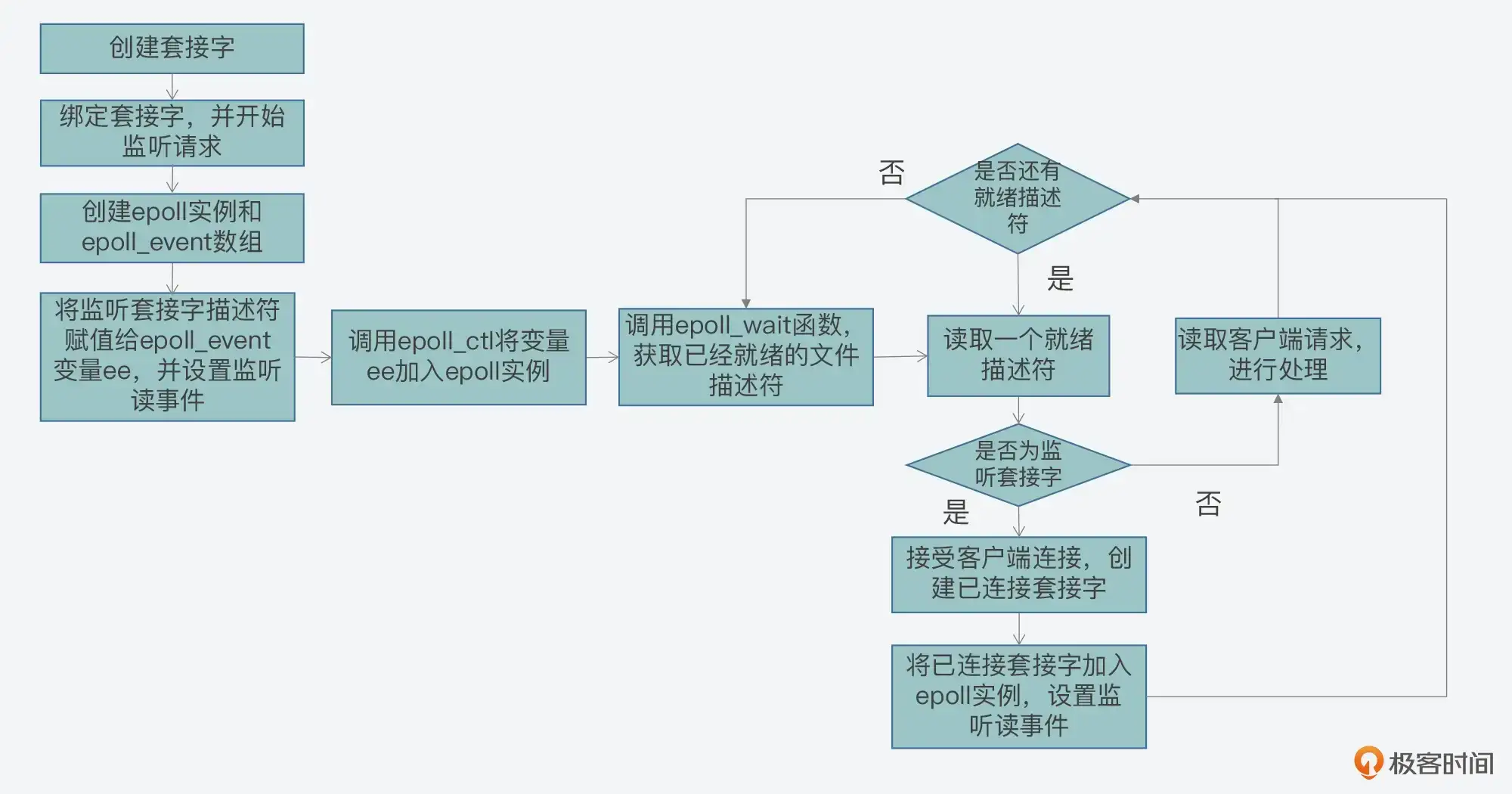 下面的代码展示了使用 epoll 函数的流程,你也可以看下。