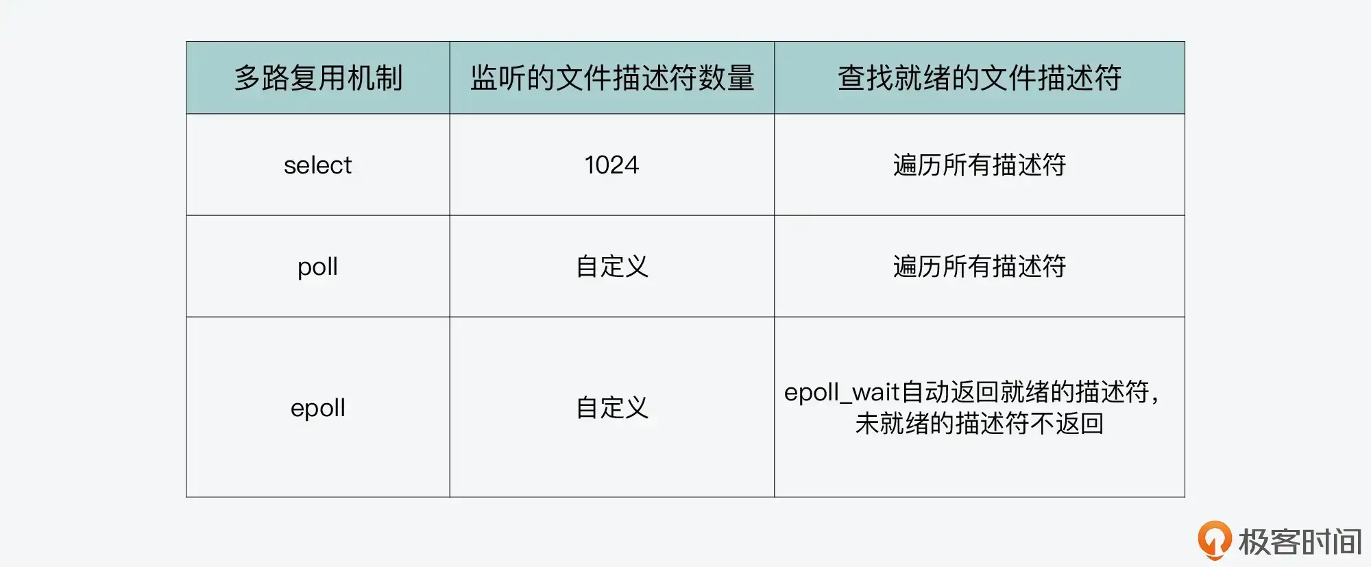这节课,我是以最常用的 Linux 操作系统为例,给你具体介绍了 Linux 系统提供的三种 IO 多路复用机制,分别是 select、poll 和 epoll。这三种机制在能监听的描述符数量和查找就绪描述符的方法上是不一样的,你可以重点参考下图,来掌握它们的不同之处。这些差异,其实也决定了 epoll 相比于 select 和 poll 来说,效率更高,也应用更广泛。