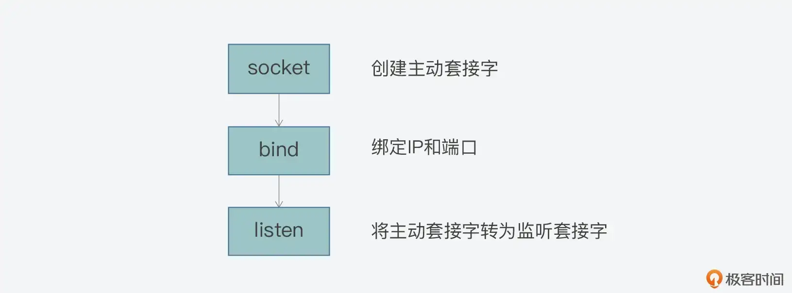 首先,当我们需要让服务器端和客户端进行通信时,可以在服务器端通过以下三步,来创建监听客户端连接的监听套接字(Listening Socket):