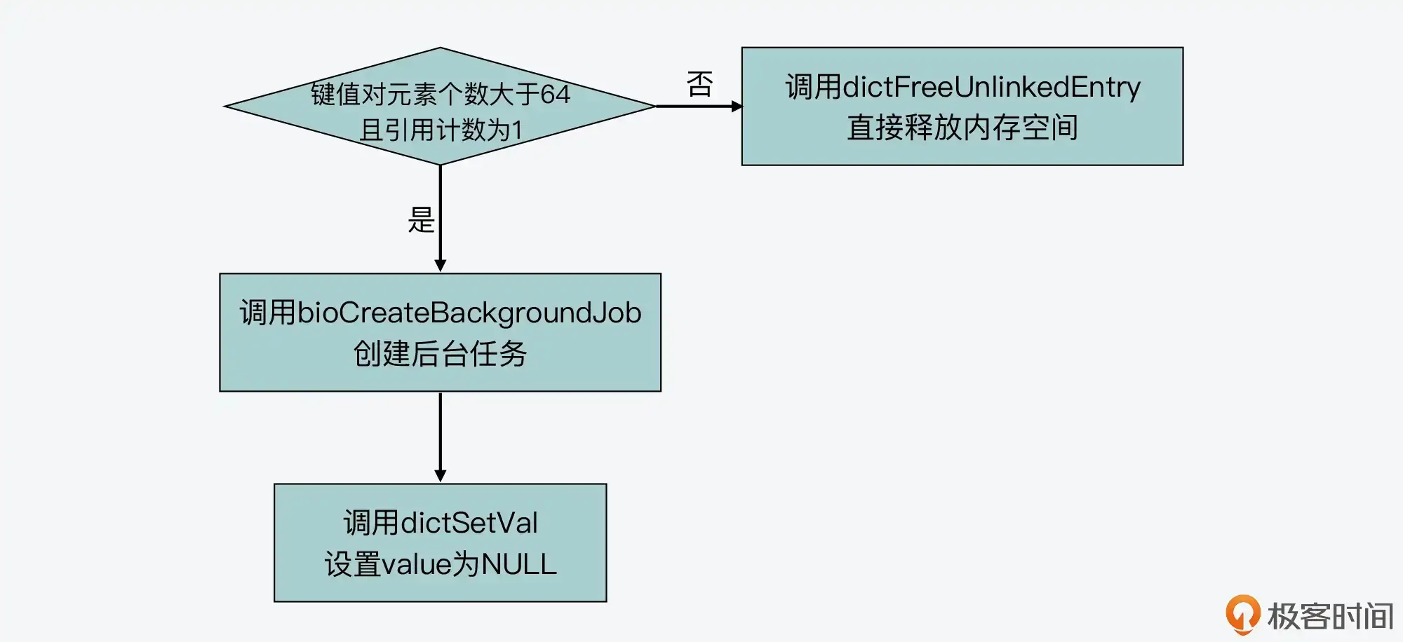 所以到这里,我们就知道了 freeMemoryIfNeeded 函数在选定被删除的键值对后,可以通过异步或同步操作来完成数据的实际删除。那么,数据异步删除和同步删除具体又是如何执行的呢?