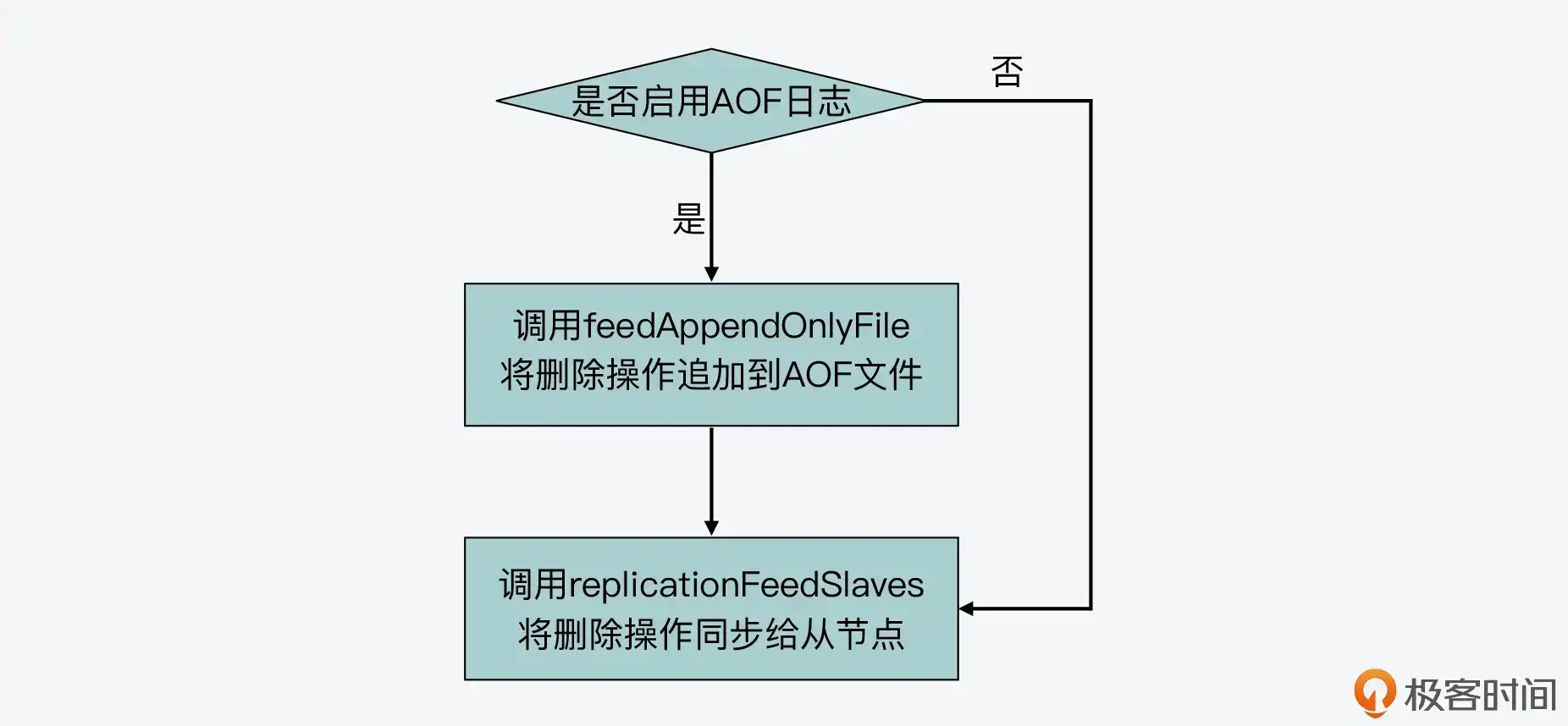 紧接着,propagateExpire 函数会判断 Redis server 是否启用了 AOF 日志。如果启用了,那么 propagateExpire 函数会先把被淘汰 key 的删除操作记录到 AOF 文件中,以保证后续使用 AOF 文件进行 Redis 数据库恢复时,可以和恢复前保持一致。这一步是通过调用 feedAppendOnlyFile 函数(在aof.c文件中)来实现的。