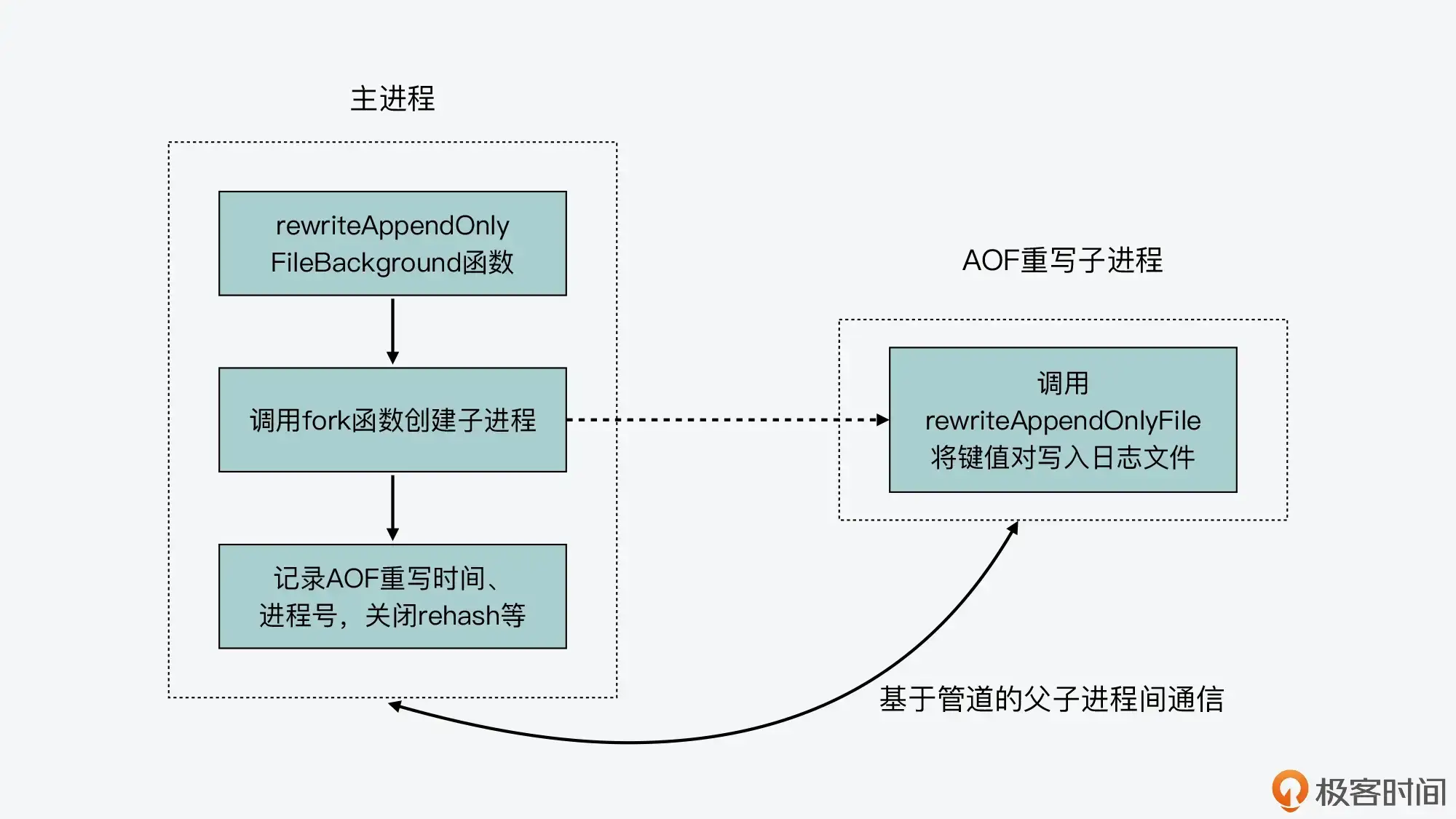 下图就展示了 rewriteAppendOnlyFileBackground 函数执行的基本逻辑、主进程和 AOF 重写子进程各自执行的内容,以及主进程和子进程间的通信过程,你可以再来整体回顾下。