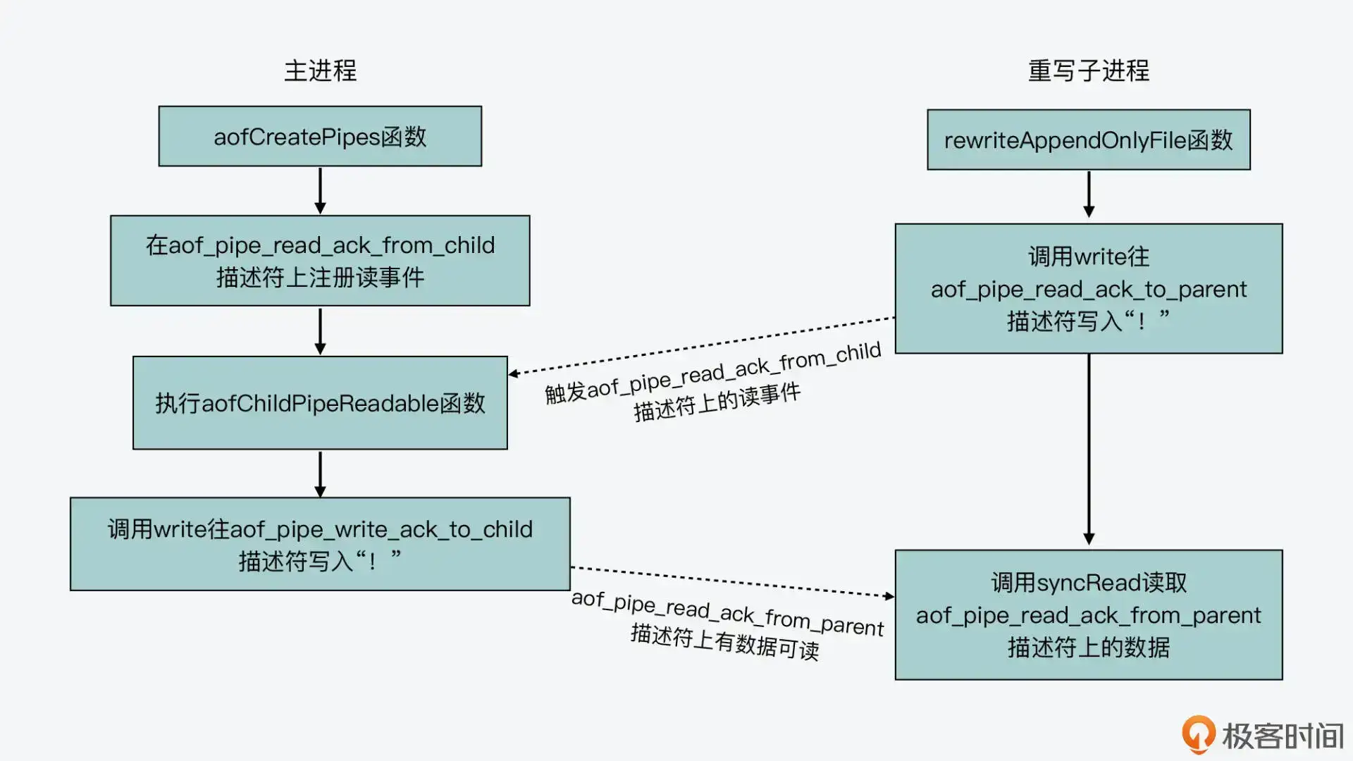这个函数会判断从 aof_pipe_read_ack_from_child 管道描述符读取的数据是否是“!”,如果是的话,那它就会调用 write 函数,往 aof_pipe_write_ack_to_child 管道描述符上写入“!”,表示主进程已经收到重写子进程发送的 ACK 信息,同时它会给重写子进程回复一个 ACK 信息。这个过程如下所示: