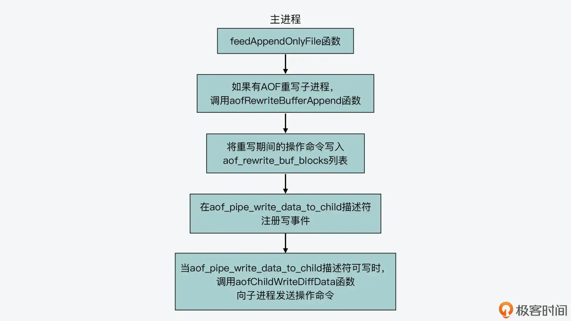 好了,现在你就了解了如何使用管道来进行父子进程的通信了。那么下面,我们就来看下在 AOF 重写过程中,重写子进程是如何用管道和主进程(也就是它的父进程)进行通信的。