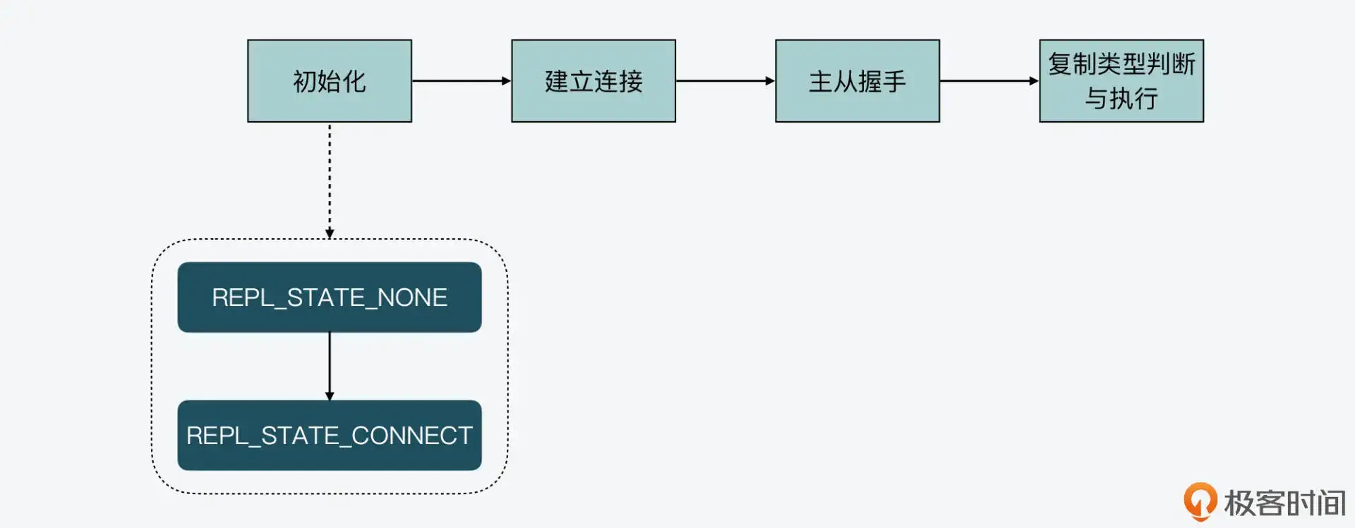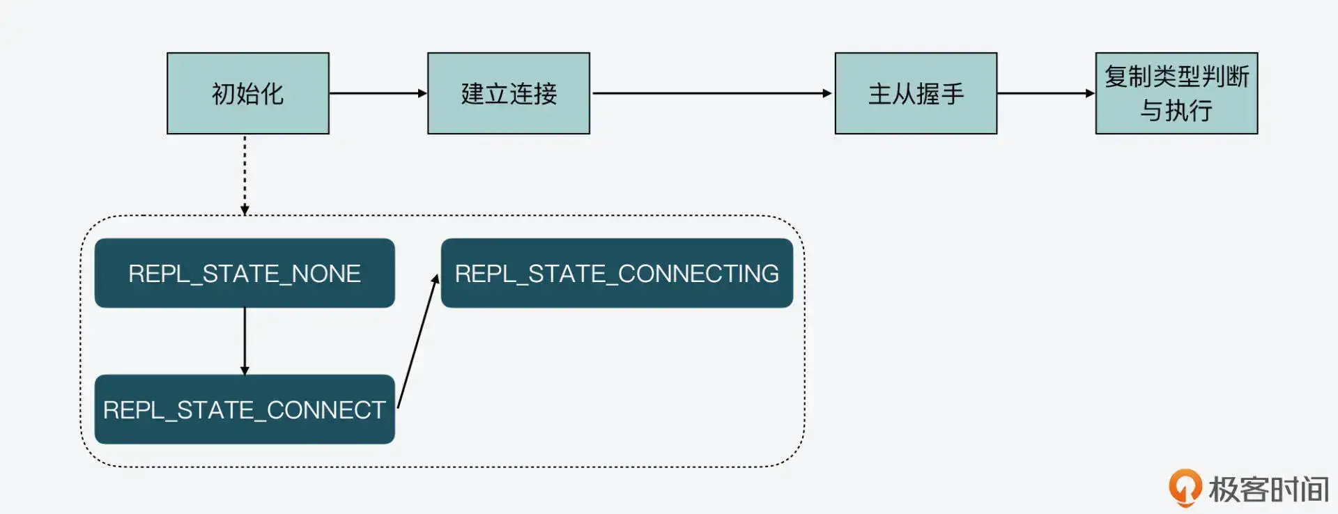 而 replicationSetMaster 函数除了会记录主库的 IP、端口号之外,还会把从库实例的状态机设置为 REPL_STATE_CONNECT。此时,主从复制的初始化阶段就完成了,状态机会从 REPL_STATE_NONE 变迁为 REPL_STATE_CONNECT。这个过程如下所示: