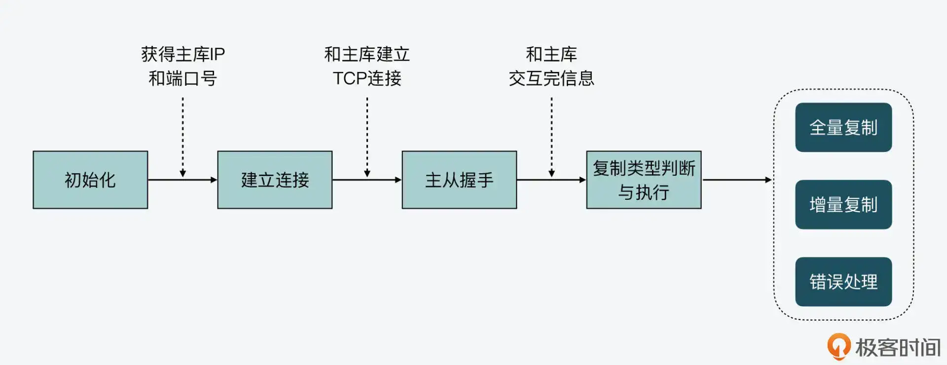 这三种情况看似简单,但是在实现的时候,我们通常都需要考虑主从连接建立、主从握手和验证、复制情况判断和数据传输等多种不同状态下的逻辑处理。