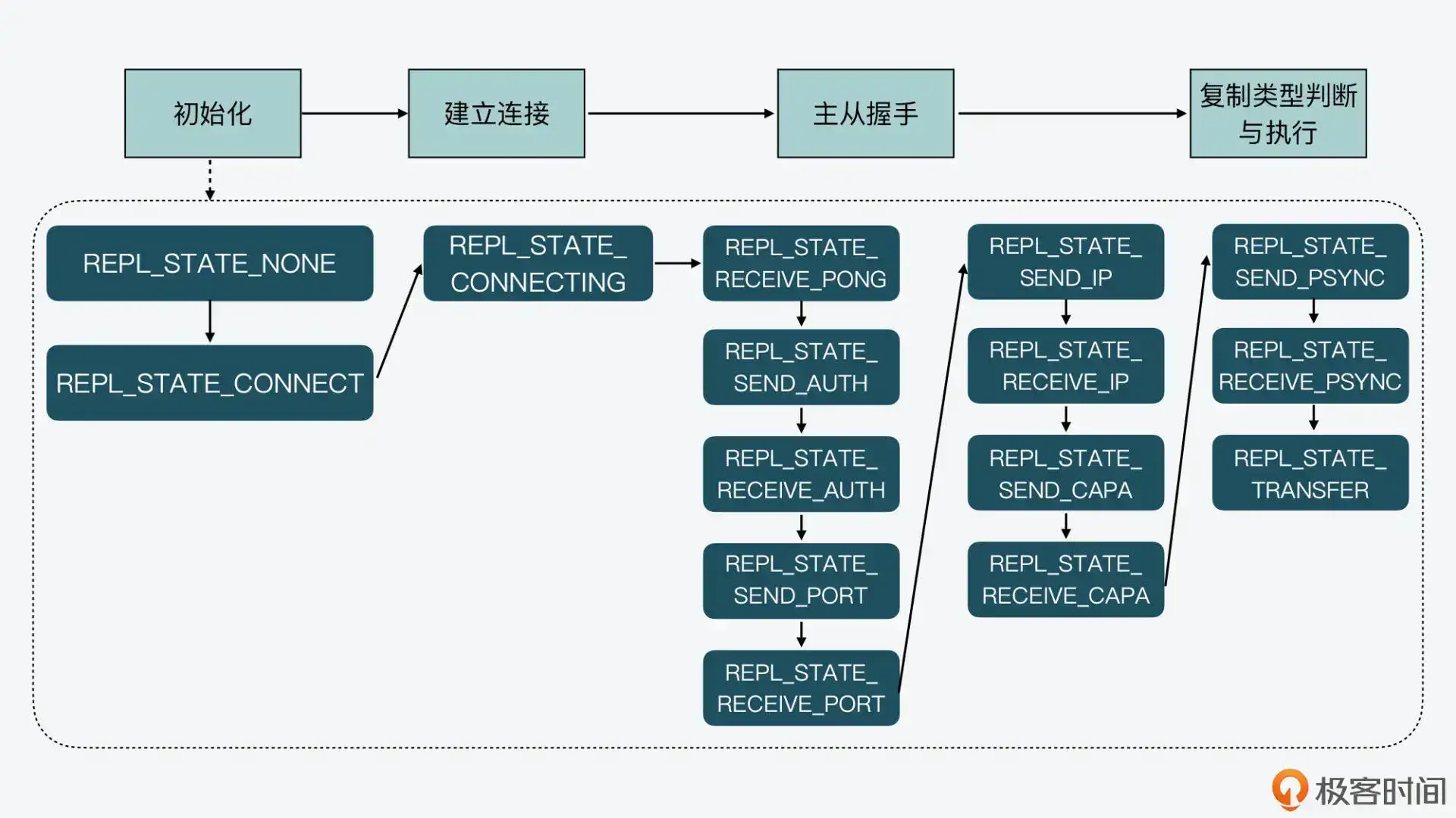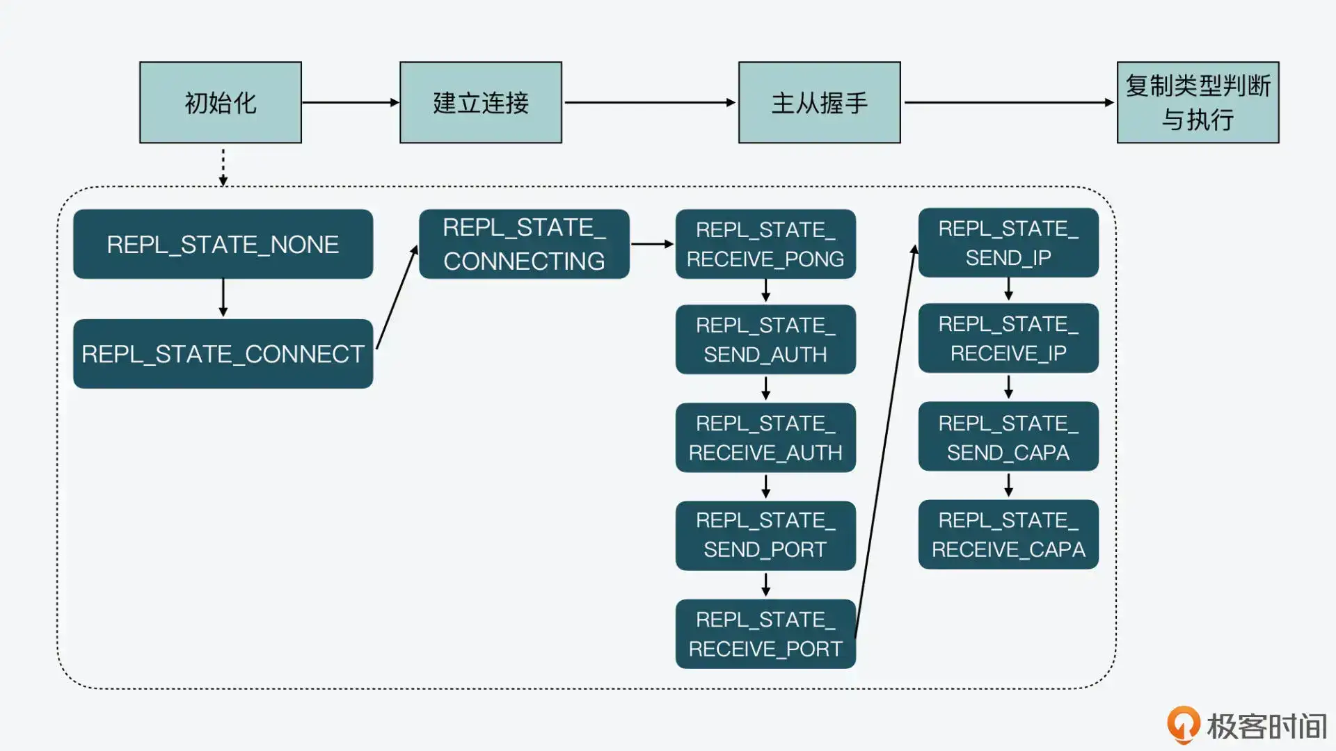好,接下来,我们就按照主从复制的四个阶段,来依次学习每个阶段中状态机的变迁,以及相应的代码实现。