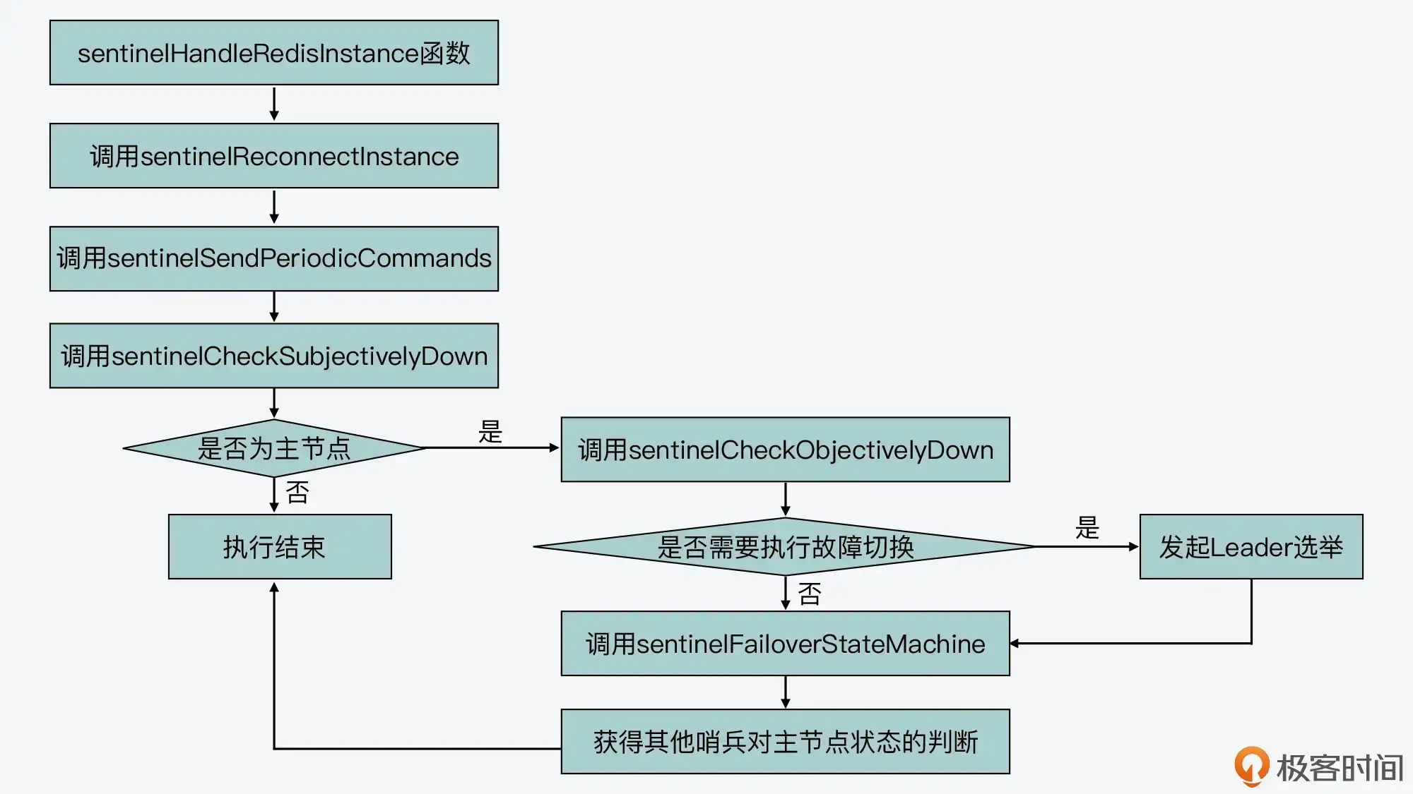 好了,到这里,我们就了解了哨兵实例的时间事件处理函数 sentinelTimer。在该函数的执行流程中,你需要重点关注的是 sentinelHandleRedisInstance 函数,这是哨兵周期性检测主节点下线状态和执行故障切换的主要函数。并且一旦需要执行故障切换,哨兵的 Leader 选举也会发生在这里。所以接下来,我们就来具体学习下 sentinelHandleRedisInstance 函数的实现。